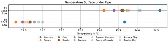 In the 16 mm model, the concrete had the highest surface temperatures under the pipe: 23.67 °C (6 cm) and 24.6 °C (1 cm). Spruce exhibited the lowest values, at 20.79 °C and 23.12 °C, respectively. Bamboo was at 21.28 °C (6 cm) and 23.73 °C (1 cm). The hybrid beech-concrete model exhibited a notable temperature increase, ranging from 21.5 °C (6 cm) to 24.08 °C (1 cm). Figure 13 shows the temperature distributions.