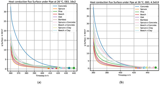 Heat conduction flux at the surface under the pipe with an embedding depth of 3 cm, an inlet temperature of 26 °C and a (a) 16 mm pipe diameter and (b) 4.3 pipe diameter.