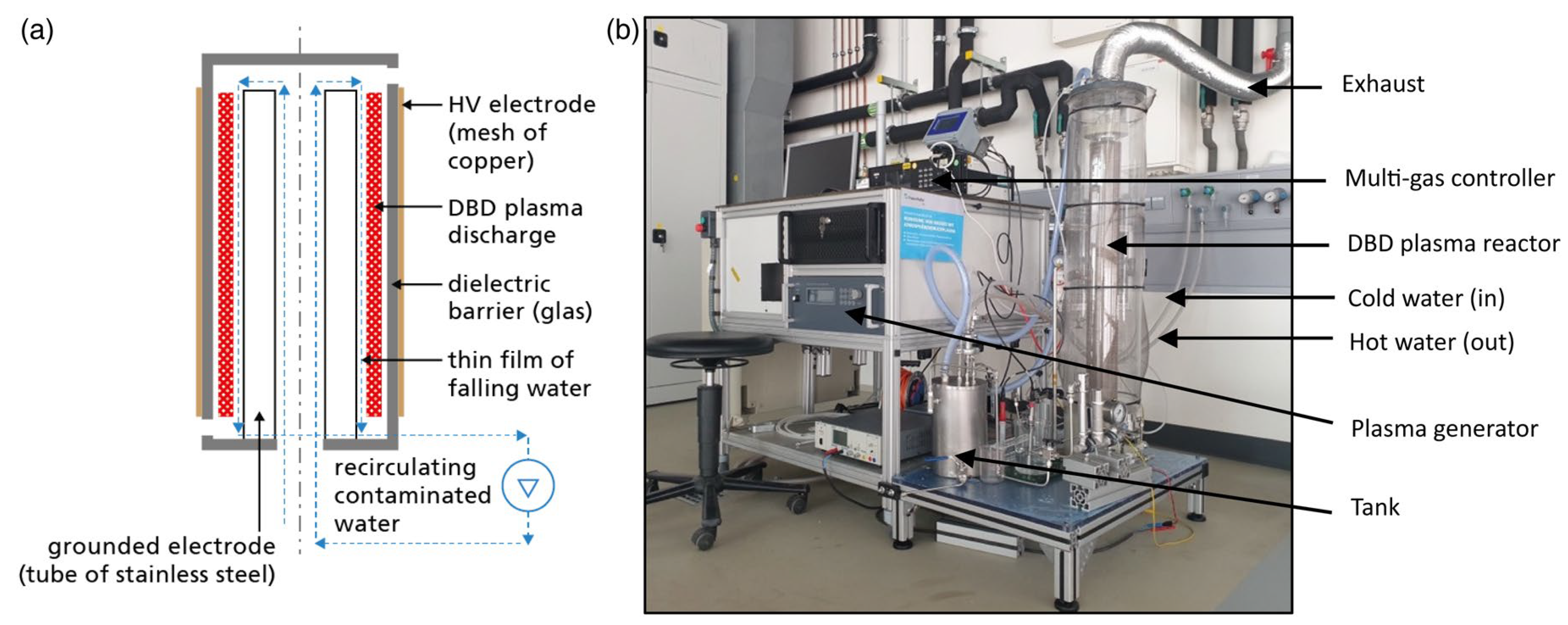 | Falling-film DBD | PFOS, PFOA | 5 L | 63.8%(PFOA); 45%(PFOS) | 0.31–15.31 (mg kWh−1) | Continuous film design | NA | Improved interface contact | [92] |