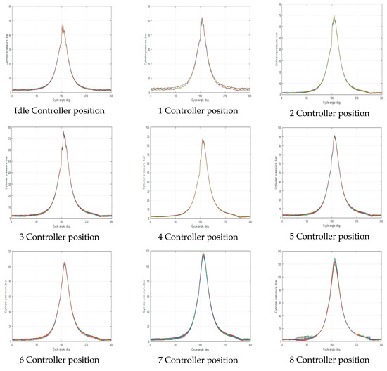 Figure 2 shows graphs of experimental indicator diagrams of 38 consecutive operating cycles at engine operation in different modes. These indicator diagrams are the basis for the performed analytical study. Figure 2 shows these indicator diagrams illustratively.
