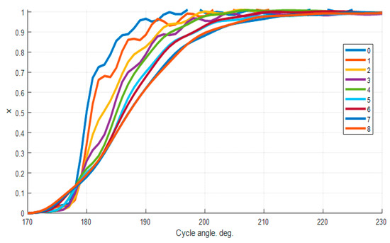 The integral combustion law shows the relative amount of fuel burned in the cylinder by a certain moment of the cycle (crankshaft angle of rotation). Obviously, the condition x = 1 is fulfilled at the end of combustion (i.e., all fuel is burnt out). The moment of combustion start is determined by the condition x > 0. The graphs in Figure 3 show that the integral laws of fuel combustion in a diesel cylinder vary depending on its operating mode (load). Thus, when operating at controller positions 0, 1, or 2, where fuel delivery is minimal, combustion duration is 20–25 degrees of crankshaft rotation. It is also clear that combustion duration gradually increases with increasing load, reaching 55–60 degrees, which corresponds to controller positions 6–8. Furthermore, it could be observed that combustion begins earlier at higher load modes.