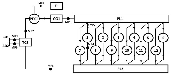 The schematic and composition of the mathematical model of the EMD 12-645E3C engine are shown in Figure 4. The following diagram shows the individual engine components: E1—engine as a unit, TC1—turbocharger, MC1—mechanical drive, PDC1—driven compressor, CO1—charge air cooler, PL1—intake manifold, C1-C12—engine cylinders, PL2—exhaust manifold, MP1-MP7—measurement points of parameters, SB1—inlet boundary conditions, SB2—outlet boundary conditions.