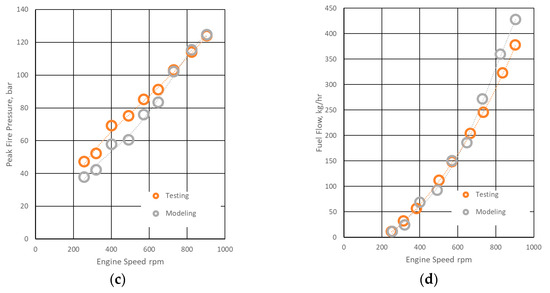 Diesel engine modeling results: (a)—effective power; (b)—indicated power; (c)—peak fire pressure; (d)—fuel flow.