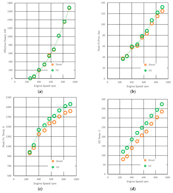 From the calibrated model and its comparison with test data (Table 3, Table 4 and Table 5), we infer the principal differences in engine behavior between hydrogen and diesel operation at matched effective power across the full locomotive rating curve (see Figure 6).