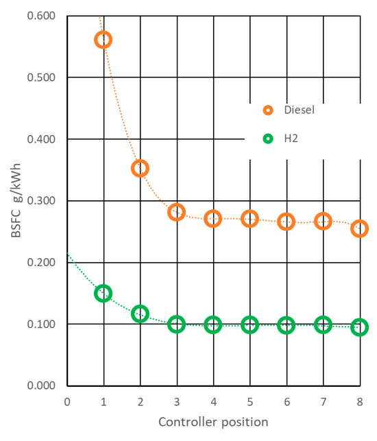 Mapping the mode-wise mass flows to effective power yields the brake-specific fuel consumption (BSFC) trends in Figure 8. As expected, idle (position 0) produces negligible effective power, so BSFC tends to be infinite. For mid–high load (positions 3–8), BSFC is nearly invariant and scales with the LHV ratio noted above. Study showed that specific effective consumption of diesel fuel is 260–270 g/kWh, and hydrogen is 90–100 g/kWh.