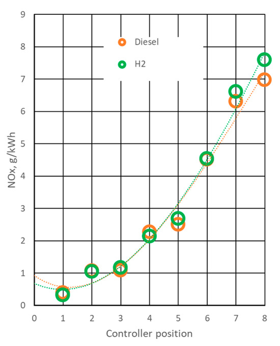 Thus, the operational emissions of nitrogen oxides increase by 3.5% when using hydrogen, and an increase is observed at higher controller positions (see Table 7). This is explained by the higher adiabatic flame temperature of hydrogen in the cylinder. In overall hydrogen impact on the increase in NOx emissions could also be a combination of many operational factors, such as engine load, speed, combustion-system design, as well as fuel injection parameters [26]. NOx flow based on the weight factor at different controller positions is also calculated and reflected in Figure 10b.