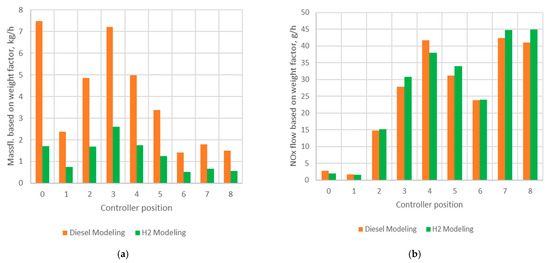 Diesel and hydrogen modeling results: (a)—fuel mass flow based on weight factor at different controller positions; (b)—NOx flow based on weight factor at different controller positions.