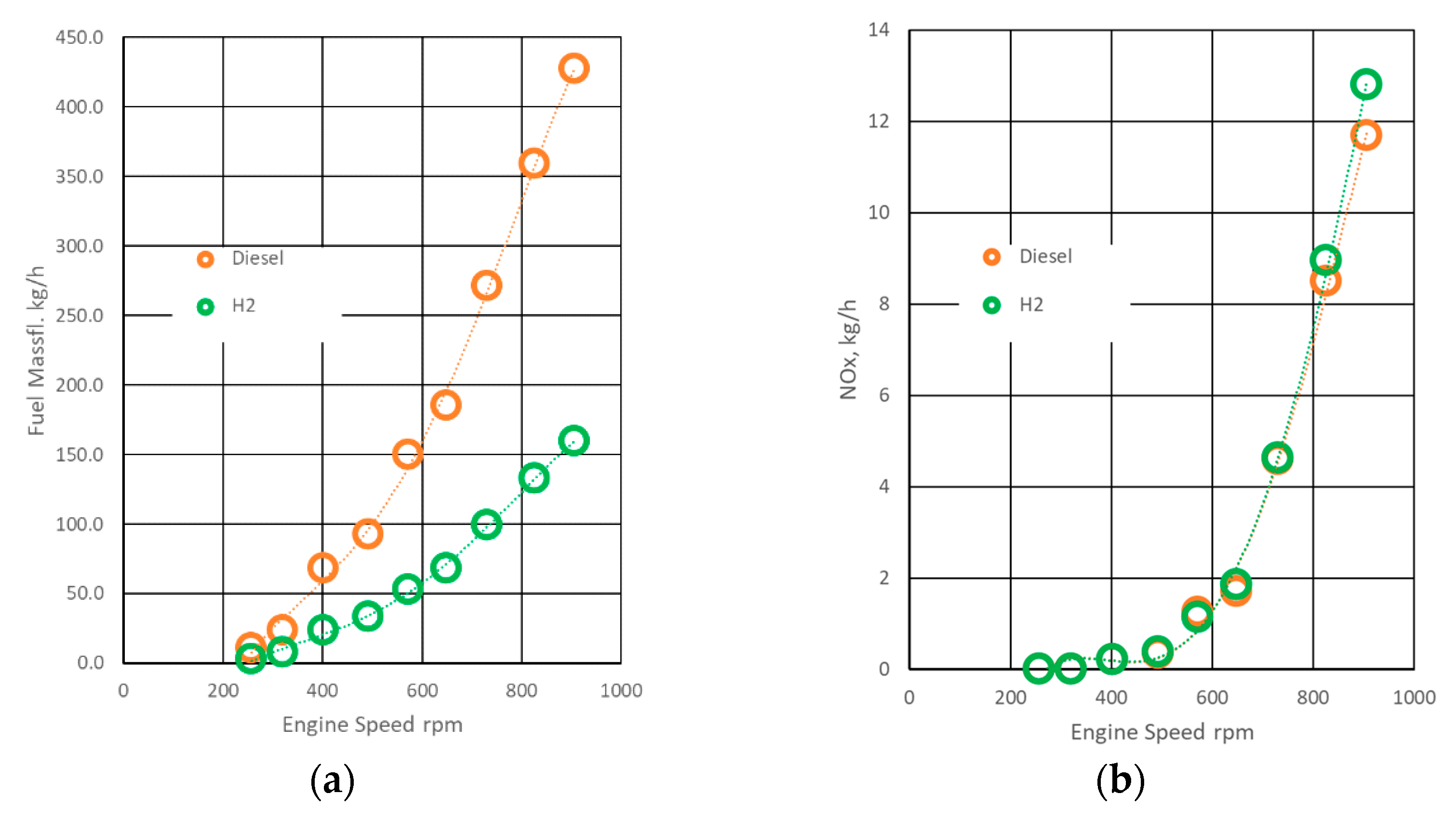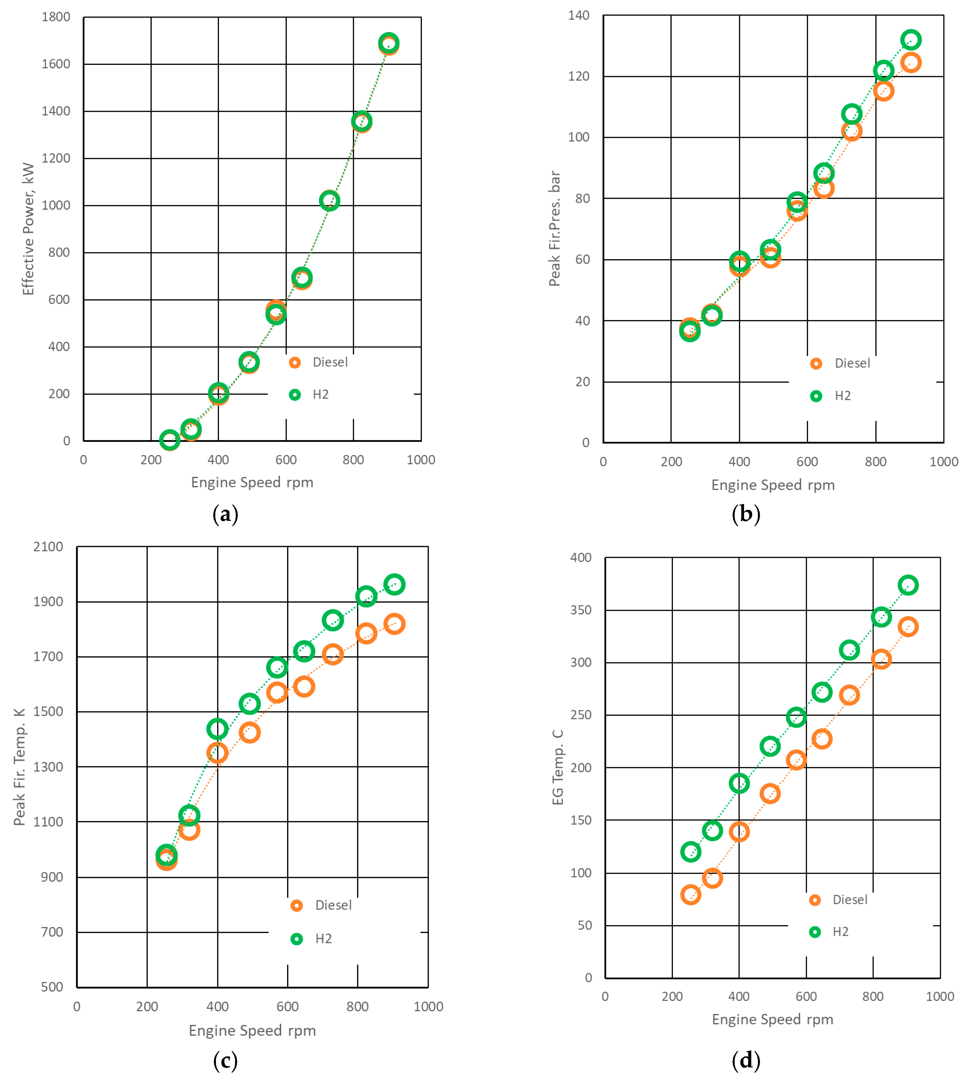 - Mass fuel flow: the hydrogen mass flow required to hold the same brake output is substantially lower than for diesel, primarily due to hydrogen’s higher lower heating value (LHV).