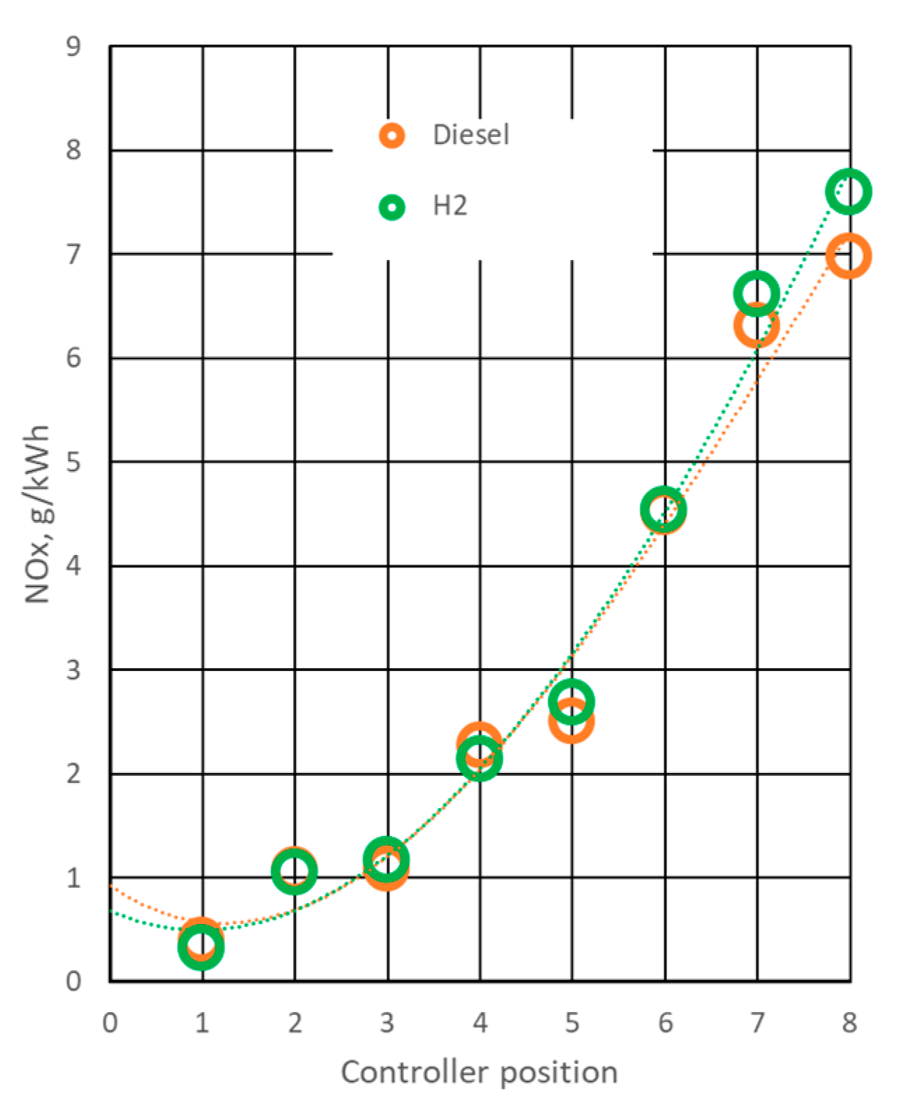 - Fuel mass consumption and energy use. The hydrogen mass flow required at matched effective power is significantly lower than for diesel, consistent with hydrogen’s higher LHV. Even after accounting for the thermal equivalent, the integral operational mass consumption implies an ≈8% energy-resource saving, attributable primarily to improved operating processes at idle and low-load regimes (controller positions 0–3).