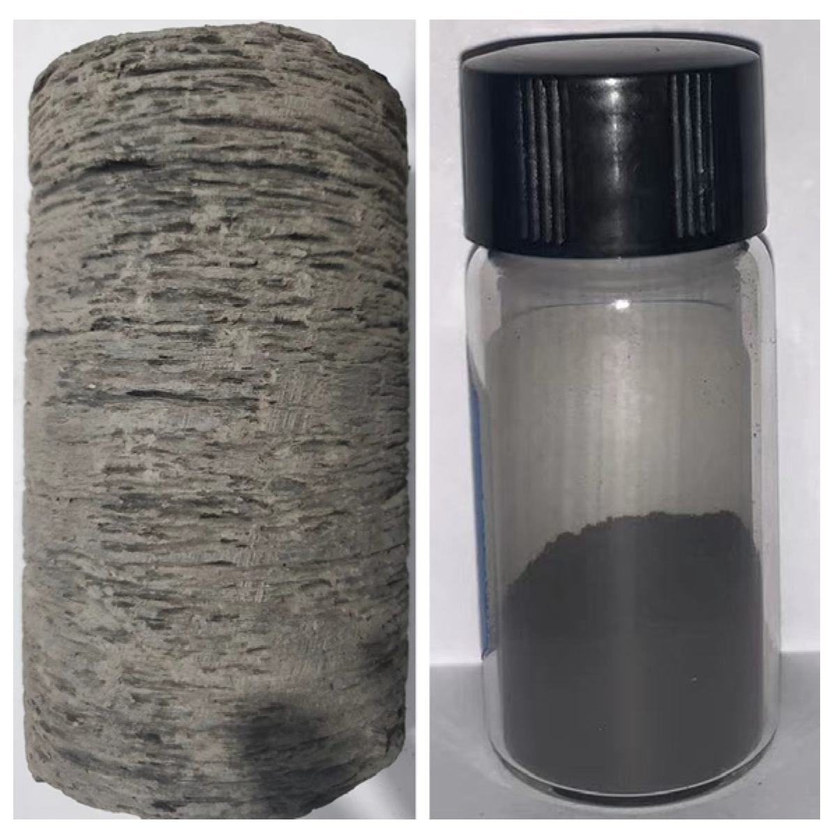 Figure 1. Shale cores and kerogen powder from Lianggaoshan Formation.