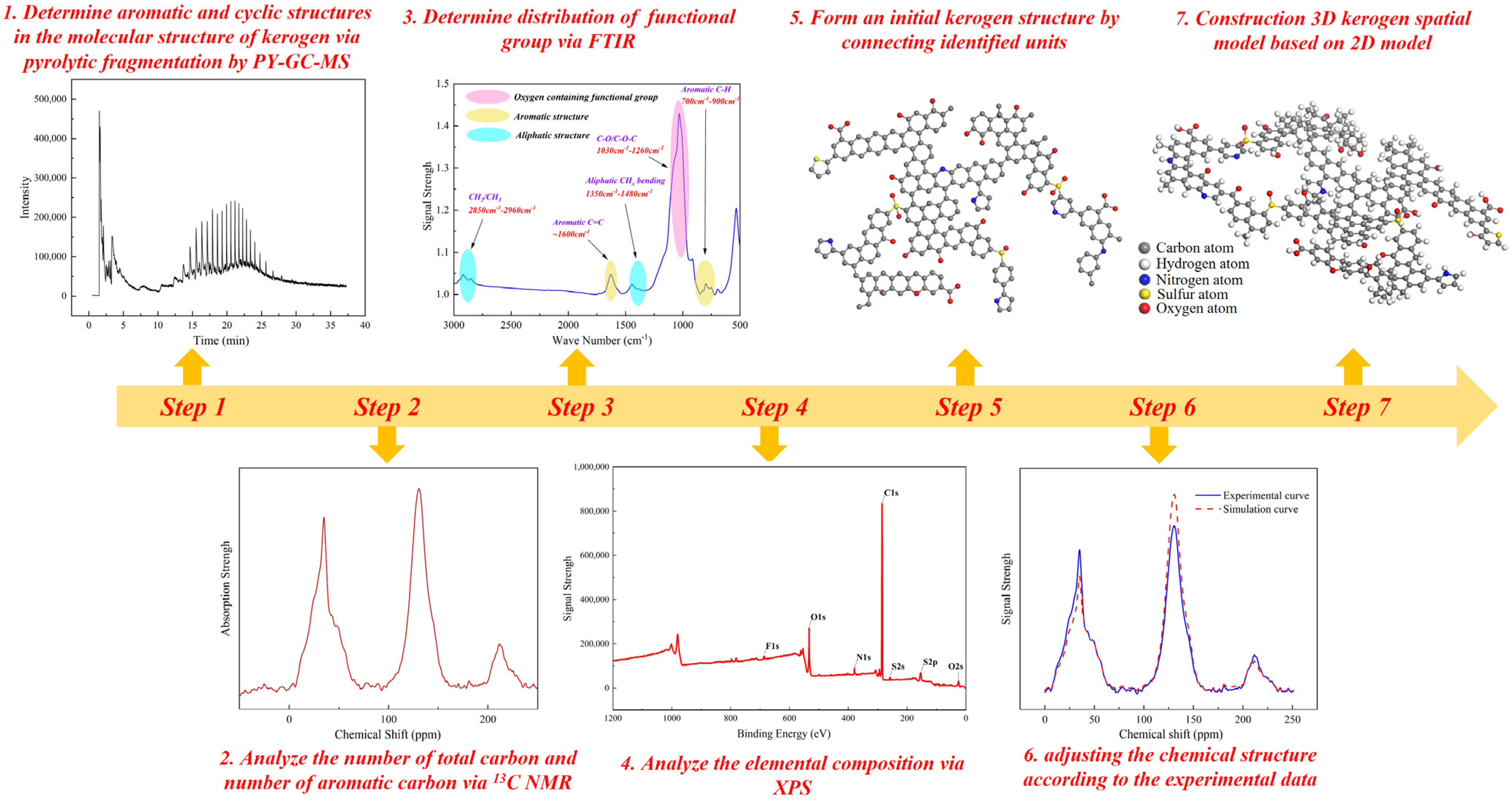 Figure 2. Flowchart of the molecular construction process of kerogen. PY-GC-MS provided constraints on the molecular fragment combinations; the formation of aromatic clusters was primarily guided by 13C NMR data, utilizing lattice parameters such as aromaticity (far), condensation degree (XBP), and aromatic substitution degree (δ). The aliphatic structure was determined mainly from FTIR and 13C NMR data, while heteroatom (O, N, and S) information was derived from XPS data. The aromatic backbone, aliphatic chains, and heteroatoms were iteratively adjusted to ensure that the constructed model exhibited strong consistency with experimental results.