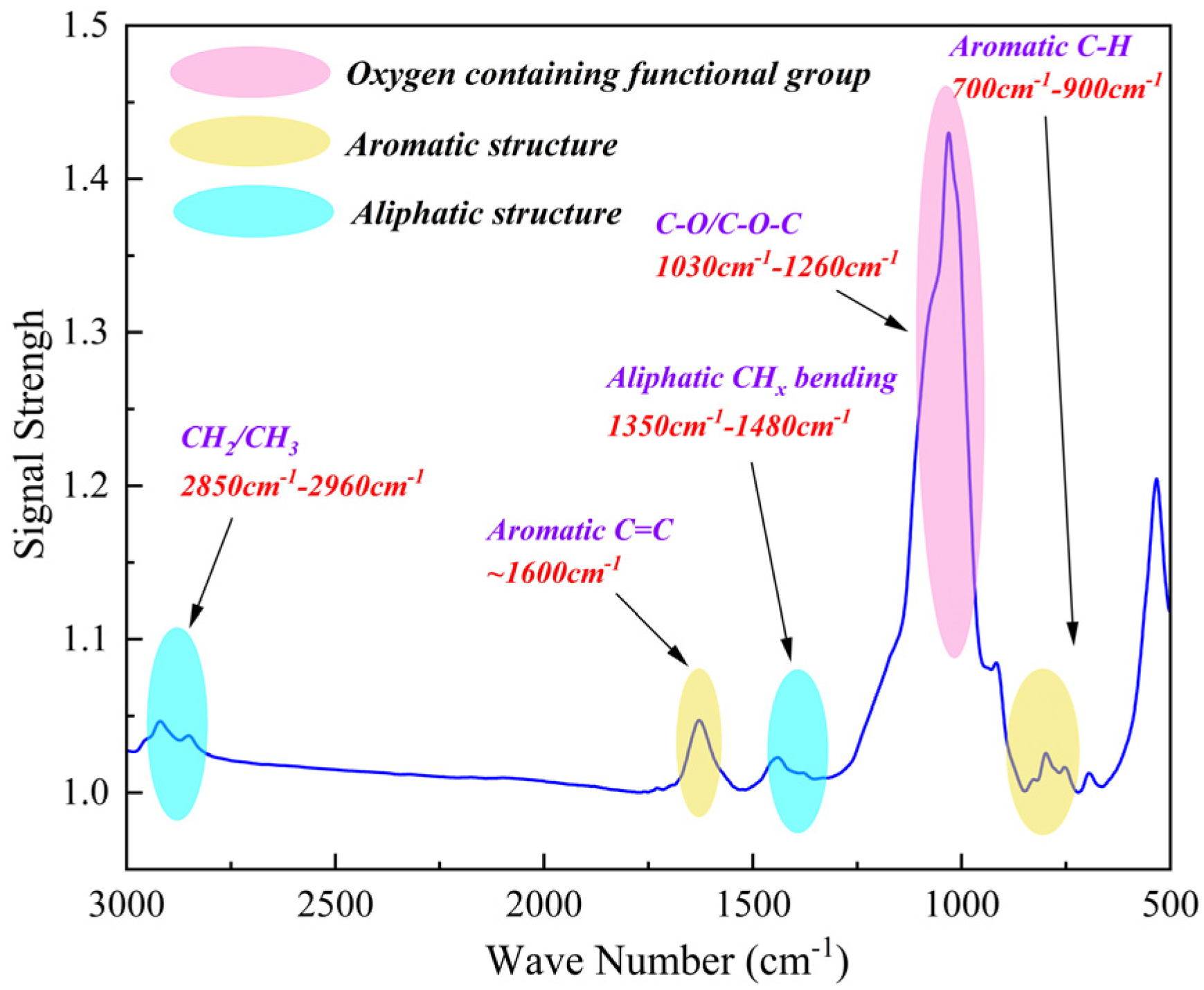 Figure 4. FTIR profiles of kerogen from Lianggaoshan shale. FTIR spectrum and assignments: 2850–2960 cm−1 (aliphatic CH2/CH3 stretching), 1350–1480 cm−1 (aliphatic CHx bending), ~1600 cm−1 (aromatic C=C stretching), 1030–1260 cm−1 (C–O/C–O–C stretching), and 700–900 cm−1 (aromatic C–H out-of-plane). pink = oxygenated, yellow = aromatic, cyan = aliphatic.