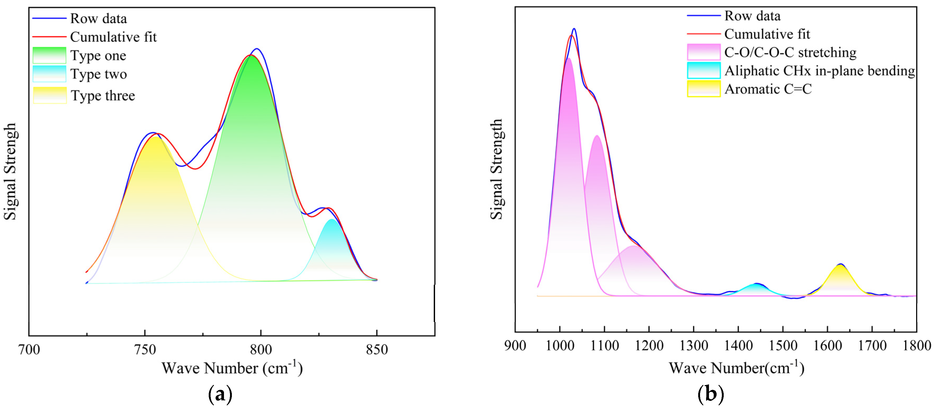 Figure 5. Wavenumber range of 700–900 cm−1 (a), Components near ~740, ~795, and ~835 cm−1 indicate para-, meta-, and ortho- substitution patterns, respectively. and (b) 1000–1800 cm−1 C-O/C-O-C stretching (1030–1260 cm−1, pink), aliphatic CHx bending (1350–1480 cm−1, cyan), and aromatic C=C (~1600 cm−1, yellow).