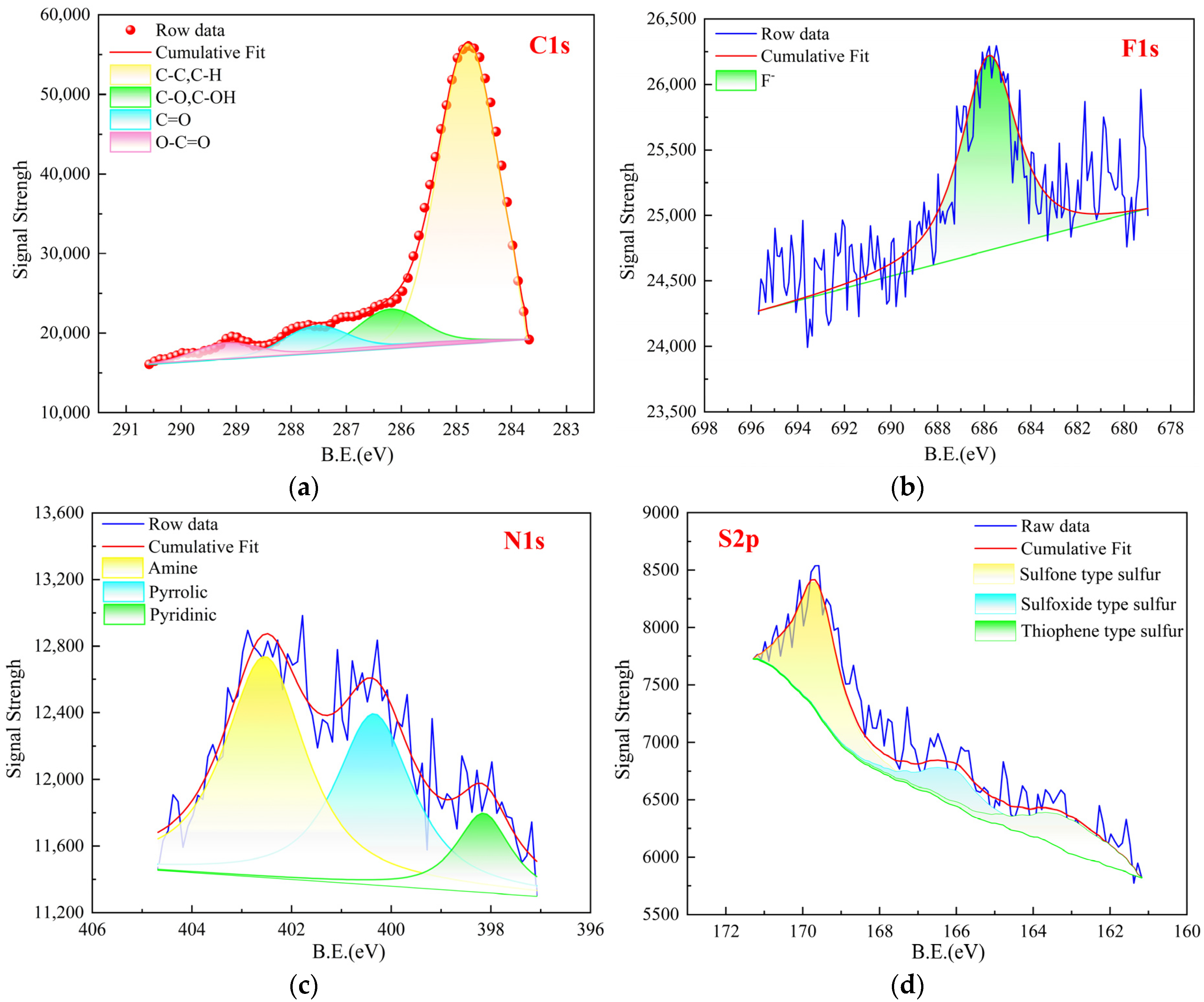 Figure 8. X-ray photoelectron spectroscopy of kerogen in C1s (a), F1s (b) N1s (c), and S2p (d), respectively. Peak positions: C–C/C–H (~284.8 eV), C–O/C–N (~286.2 eV), C=O (~287.6 eV), O–C=O (~288.8–289.2 eV); N species at ~398.6 (pyridinic), ~400.0–400.5 (pyrrolic), ~401.0–401.5 eV (Amine); S2p split into 163.8 (thiophene), 166.1 (sulfoxide), 169.8 (sulfone).