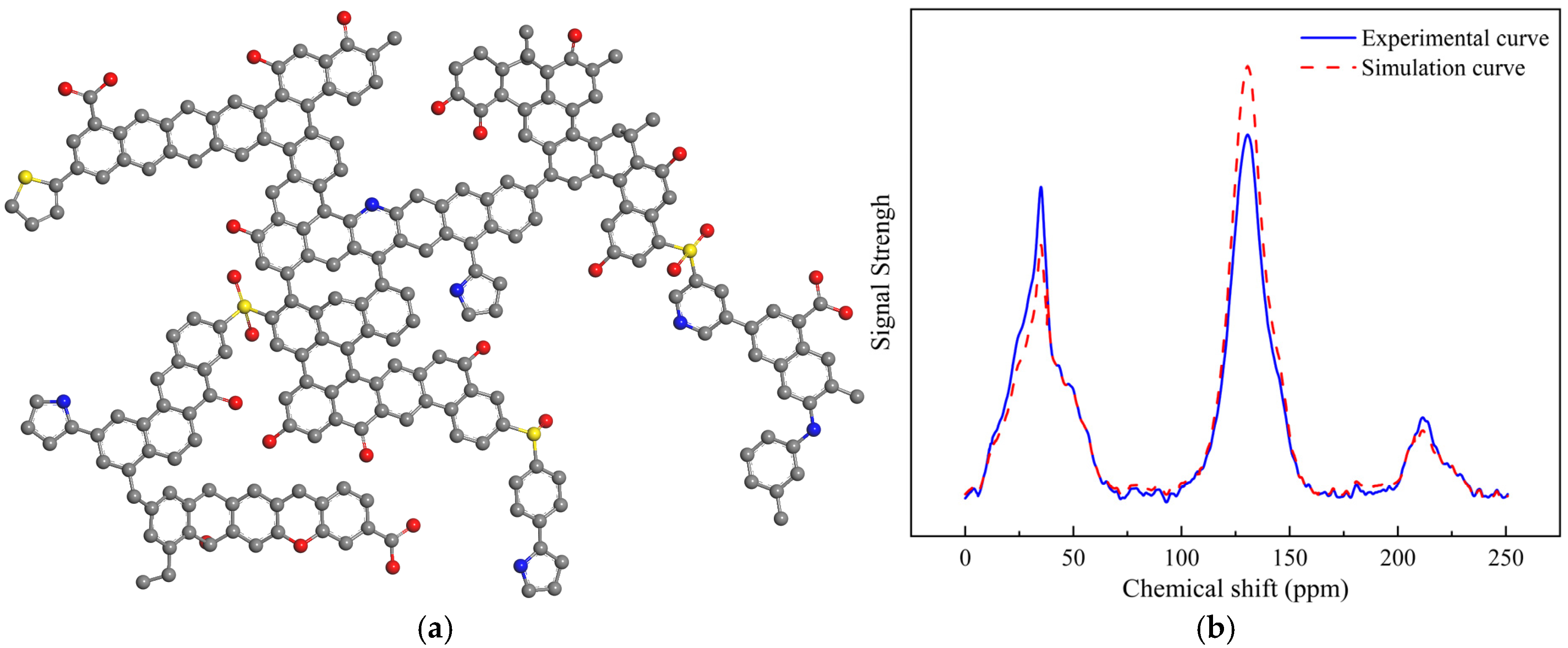 The construction of the kerogen chemical structure was primarily based on the analysis of experimental data from PY-GC-MS, 13C NMR, FTIR, and XPS. The specific steps are as follows [45,46,47]: