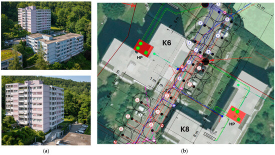 Pilot plant of the dual-source HP boiler replacement. (a) View of MFH K6 (light pink building in the back) and K8 (light blue building in the front), top, and MFH K6 and the parking lot for the installation of the BHX field, bottom. (b) Final layout of the reduced BHX field. The blue numbered ground probes belong to K6 and the red numbered ground probes to K8. The red rectangles indicate the position of the cellar rooms where the heat pumps are installed.