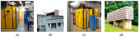 Installed dual-source HPs and AHX. (a) Indoor installed propane HP in K8; (b) AHX installed on the lift superstructure on the roof of K8; (c) indoor installed propane HP in K6; (d) AHX installed on a plinth in garden of K6. The two-stage, speed-controlled brine-to-water (B/W) HPs each consist of three parts, which are each housed in their own enclosures, see Figure 4.