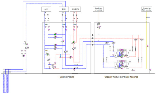 Figure 4. Hydronic sketch of the hydraulic module and the capacity module of the installed HPs. Blue lines: source circuits; dashed blue line: return flow; red lines: sink circuits; dashed red lines: return flow; yellow: supply air; green: exhaust air. - Hydraulic module, which contains the hydraulic components such as valves, pumps and plate heat exchangers.
