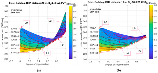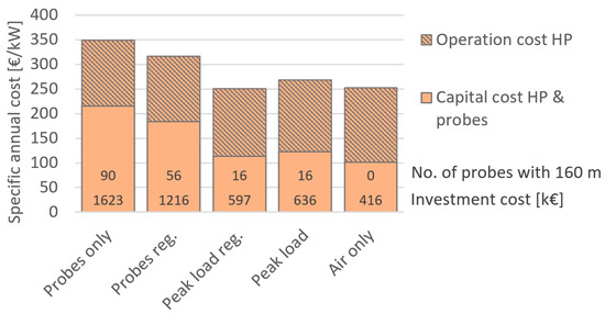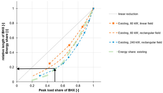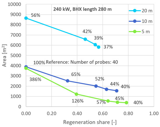The second strategy refers to a regeneration of the ground, which is already used more often in practice, as described in Section 1.1. However, as outlined above, this is often with the objective of increasing the seasonal performance and avoiding thermal imbalance of the ground source with solar or free-cooling regeneration. With regeneration, boreholes can be drilled closer together, which helps to overcome space restrictions. Without regeneration, in particular in larger compact rectangular borehole fields, the inner probes are shielded from the undisturbed ground by the outer probes and have limited natural regeneration. Thereby, the capacity decreases after some years of operation, which has to be compensated by a larger field design. With technical regeneration, the missing natural regeneration can be compensated, and the capacity of the inner probes can be kept at an acceptable level, which avoids an upscaling of the BHX, thereby saving drilling space. Depending on the degree of regeneration, the BHX can also be operated as storage in case of “over”regeneration, i.e., more heat is fed back than is extracted, and this is especially effective with a compact design with reduced borehole distance. On the other hand, regeneration requires a regeneration source, which has its own associated technical limitations like installation space or noise and its associated cost. Thus, a focus here was set on regeneration by a compact AHX and cost-optimal regeneration rates. For larger capacities in the range of 200 kW, it can also be useful to combine both strategies for higher synergies and avoidance of restrictions.
