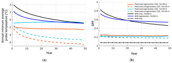 A further field of research is dedicated to solar energy as a regeneration source for the ground, e.g., [11,12,13,14,15,16,17], but mainly with the perspective of increasing the seasonal performance factor. You et al. [11] provide a review on PV/T collectors used with ground-source heat pumps, while the focus of the review of Xu et al. [12] specifically deals with hybrid ground-source HPs to avoid the thermal imbalance of the ground. Wang et al. [13] provide a review of hybrid GSHPs with different design objectives in terms of thermal ground imbalance, SPF improvement or respective energy and cost reduction, evaluation of regulative boundaries, control strategies and thermal storage in the ground, as well as combination with PCM storage. Applied heat sources are ground heat exchangers or horizontal collectors combined with different solar collector types, both thermal and PV/T, and/or outdoor air, both in source and sink integration. In conclusion, hybrid GSHPs are seen as very promising technologies for future sustainable heating systems. Regeneration of shallow borehole fields is reviewed by Kirschstein et al. [14]. They find that most regeneration sources are solar thermal flat-plate collectors, which counteract thermal ground imbalance and enable overall borehole length reduction as well as performance increases. Most investigations were carried out for single-family homes, leaving a research gap regarding larger systems for district heating or cooling as well as monitored validation of theoretical studies. Sommerfeldt and Madani [15] perform a techno-economic analysis by TRNSYS simulation of ground-source fields combined with PV/T collectors in a Swedish climate. Results yield a reduction in the overall borehole length of 18% linked to a 50% space reduction whilst maintaining the same SPF when compared to the system without the PV/T. Costs are higher compared to the combination of GSHP and PV, but this does not include land savings, which, however, increases the market potential of GSHP. Liravi et al. [16] investigate seasonal performance and investment cost for larger and smaller borehole fields in a Nordic climate with regeneration through PV/T collectors. They find a substantial overall borehole length reduction of up to 50% in particular for larger compact borehole fields, while in smaller fields, natural regeneration still plays a substantial role. Related cost savings are in the range of about 9–23% compared to GSHP and PV. PV/T integration for regeneration is thus a promising solution for Nordic countries. Adebayo et al. [17] research the solar regeneration of single- and double-U-tube borehole heat exchanges by SAHP for cold-climate applications by a finite-volume model to comprehensively evaluate the performance. Results describe a trade-off between heating and cooling operation. While the heating COP increases in heating mode by a factor of 1.21 and 1.18 compared to a GSHP, it decreases in cooling operation to a factor of 0.65 and 0.72 for a single and double U-tube, respectively. Collector tilt angles are also investigated, and an optimum of 45° for overall energy savings was found for Calgary weather data.