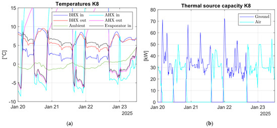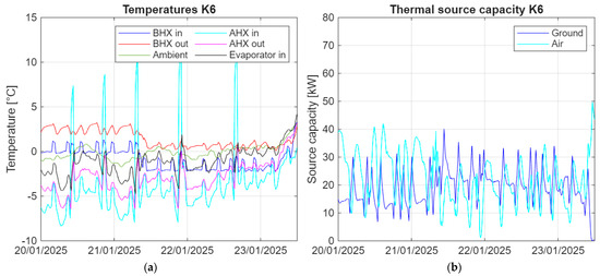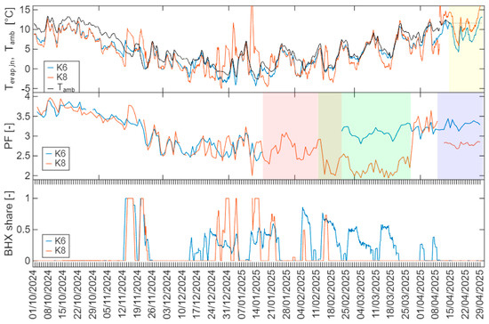The design heat load has been evaluated by measurements in the two houses in the coldest week of January 2023 with clamp-on heat meters. Results have been transformed by the energy signature method to find the design heat load at the design outdoor temperature of the site of −8 °C. Additionally, the DHW load and defrosting expenses have been added. The DHW load was recalculated from the DHW demand according to Swiss SIA 2024 of 19.8 kWh/(m2 yr) and additional 50% losses as a maximum defined in SIA 385/2 [31], including circulation, storage and distribution thermal losses and also electric expenses. The defrosting was estimated by assuming a 50% source capacity of the AHX at the coldest day and with 15% of the heating energy used for defrosting. Blocking times of the utility for the HPs, which refer to remote cutting-out of the HP operation by the utility for load management and grid stabilization purposes (common in Switzerland since the 1990s), are contractually limited to a maximum of 3 times a day for 2 h each. For allowing the remote control, users are often rewarded by special HP electricity tariffs. However, these blocking times are not applicable at the site. The derived design values and the effective design of the HPs are summarized in Table 3. The heat demand has been determined using the same area-specific values based on the oil consumption of the boiler operation, which supplied both buildings. However, since the energy reference area is larger for K6 than K8, the absolute heat demand in MWh has been derived by multiplying the specific value with the respective energy reference area. As such, the heat load differs between the two buildings due to the different size.