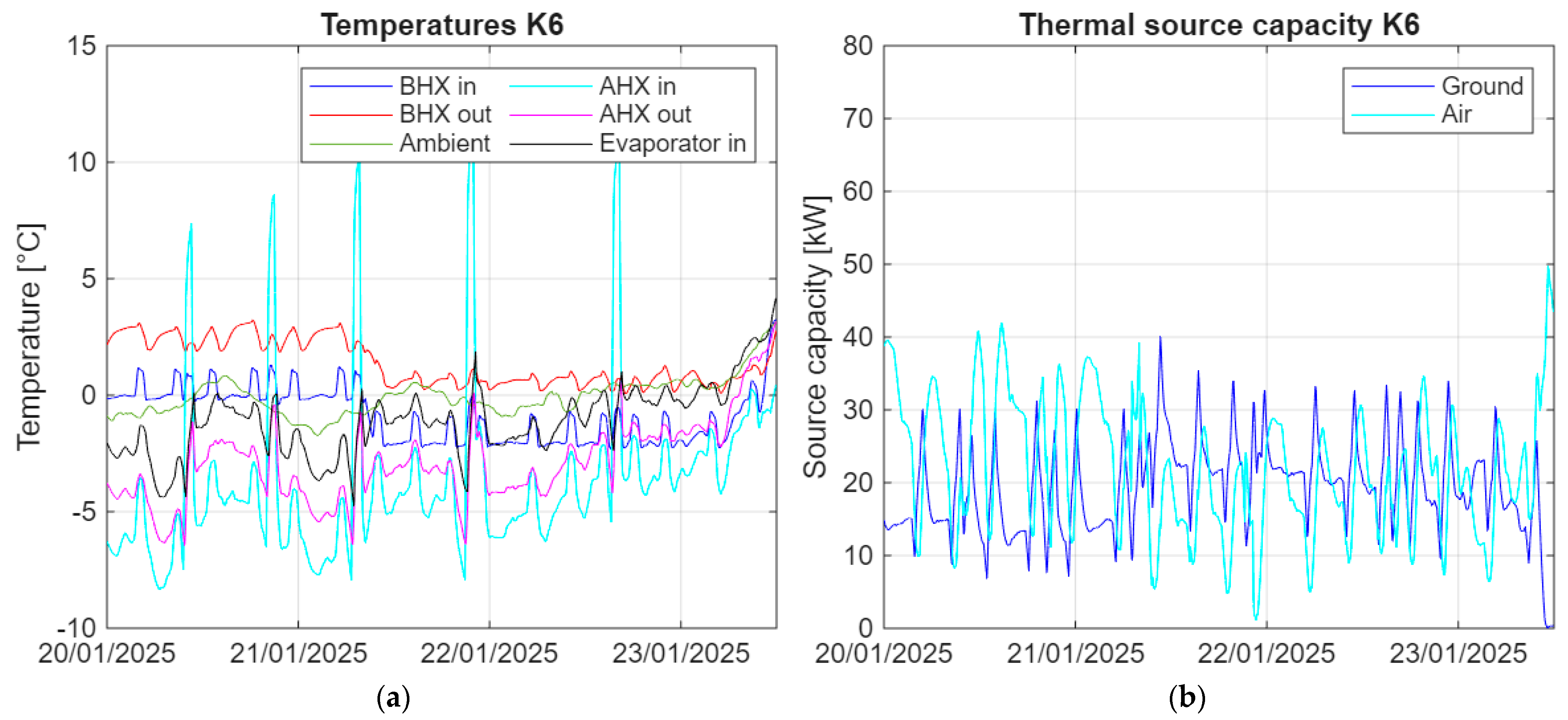 | Simulation model verification | Inlet/outlet temperatures capacities of heat sources and sinks (ground probes, AHX, HP) Electric power | Temperatures, mass flows BHX; AHX, evaporator inlet/outlet condenser out outdoor air temperature |