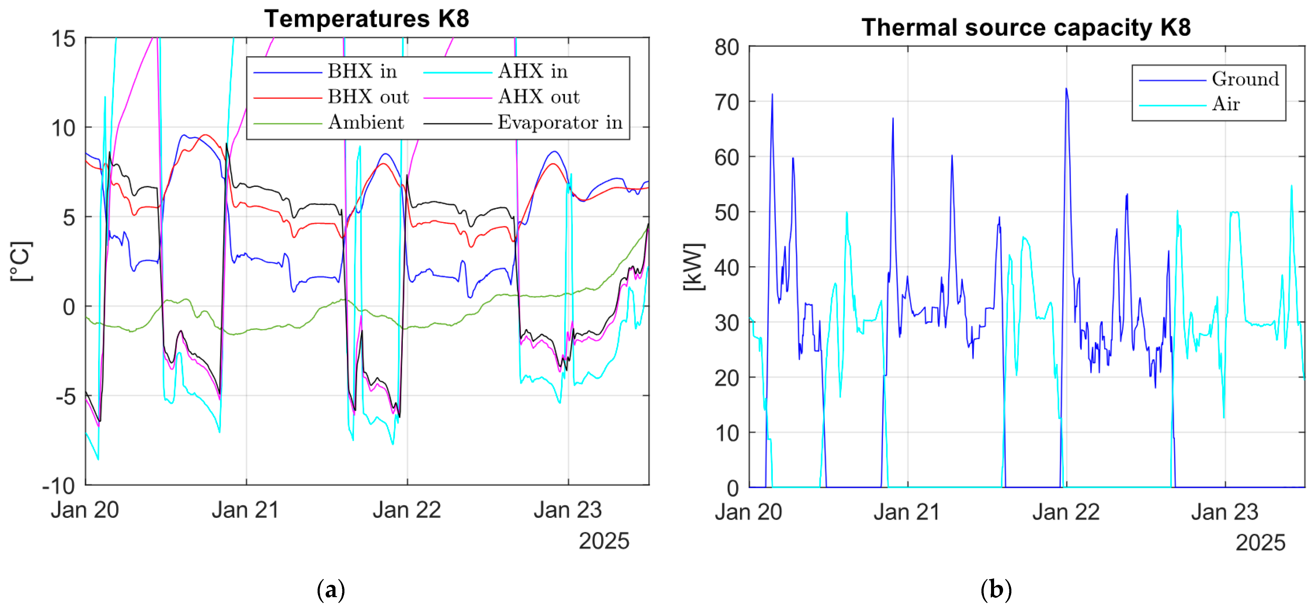 4.2. Monitoring Results of the Dual-Source HP Operation