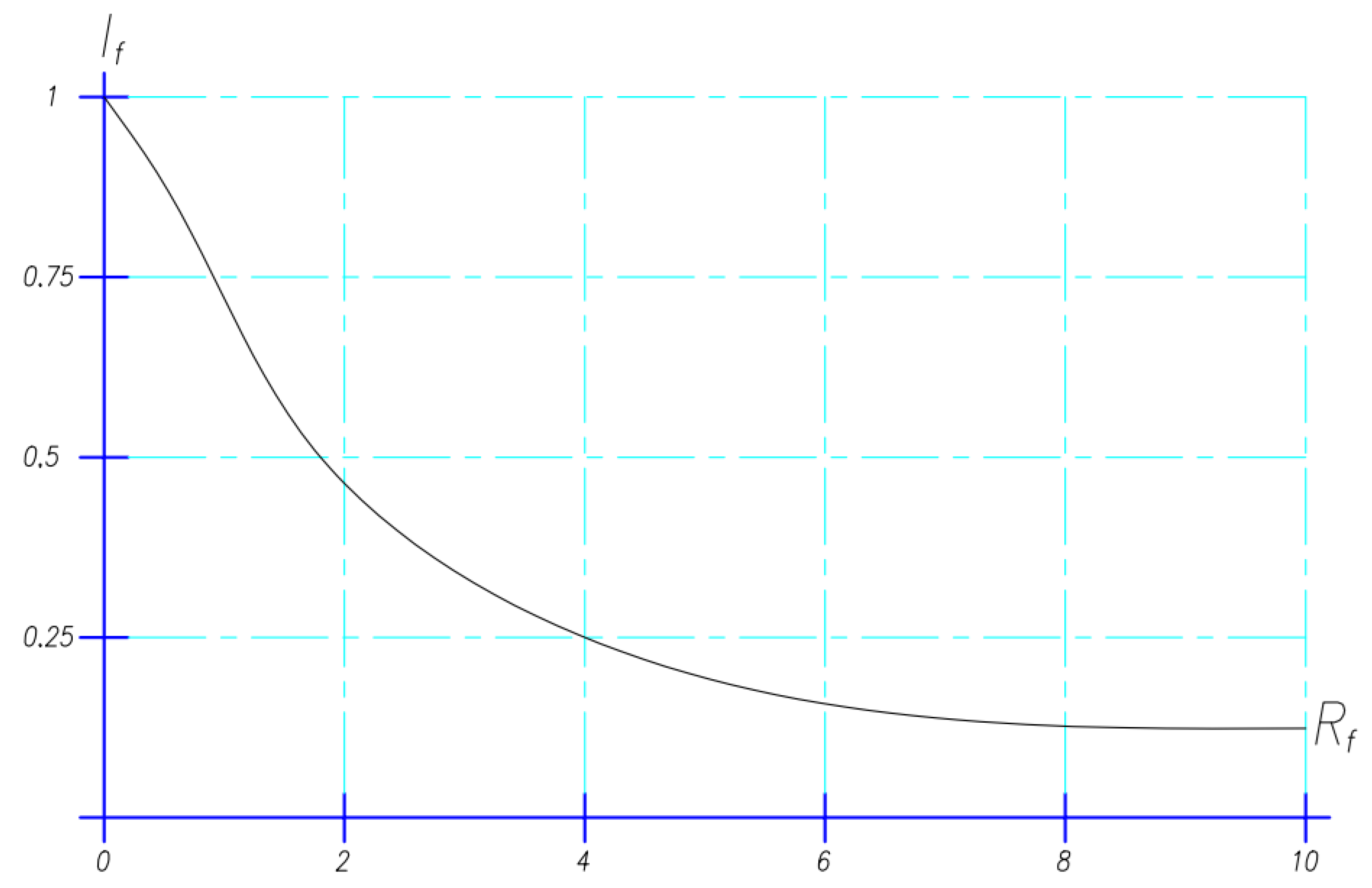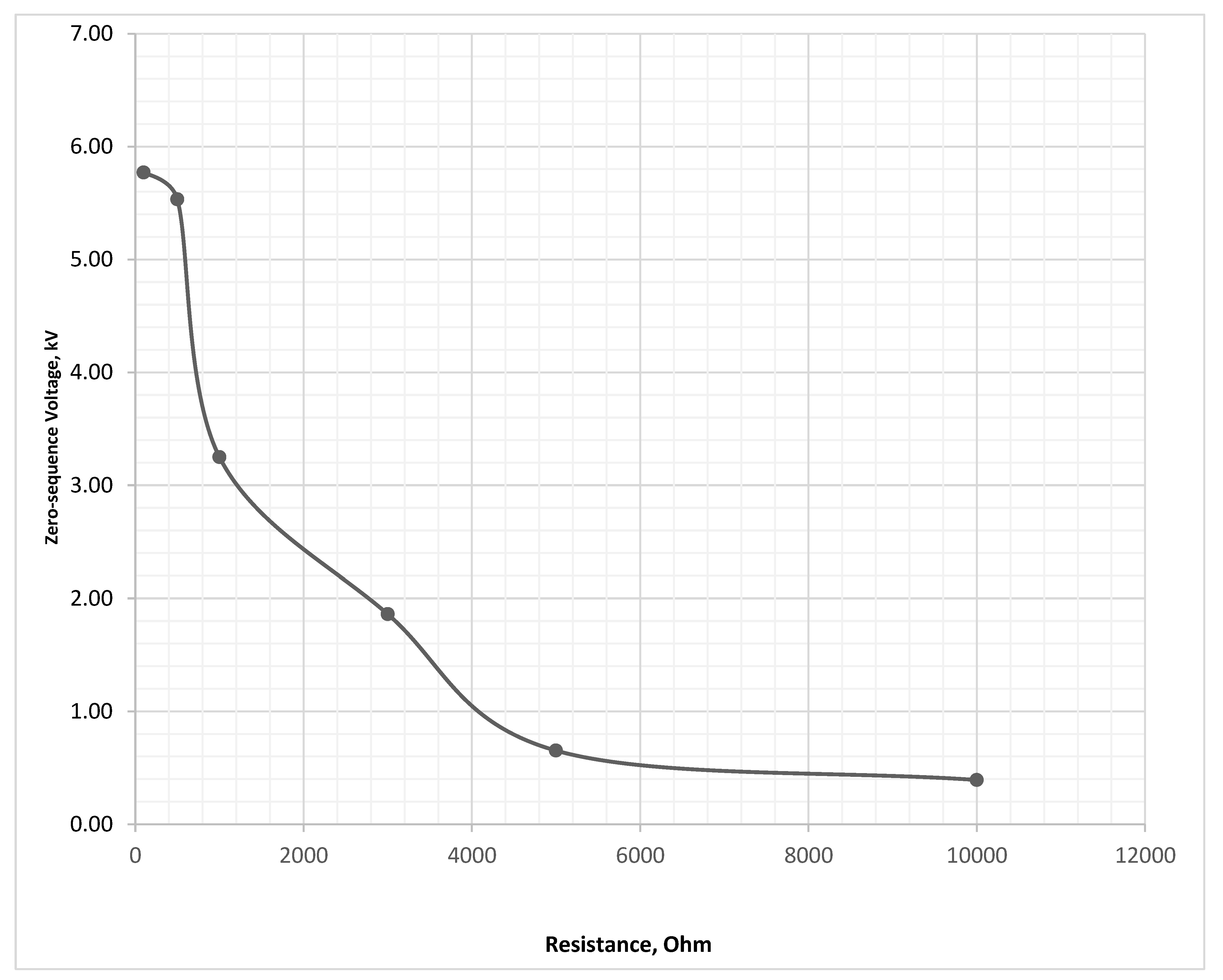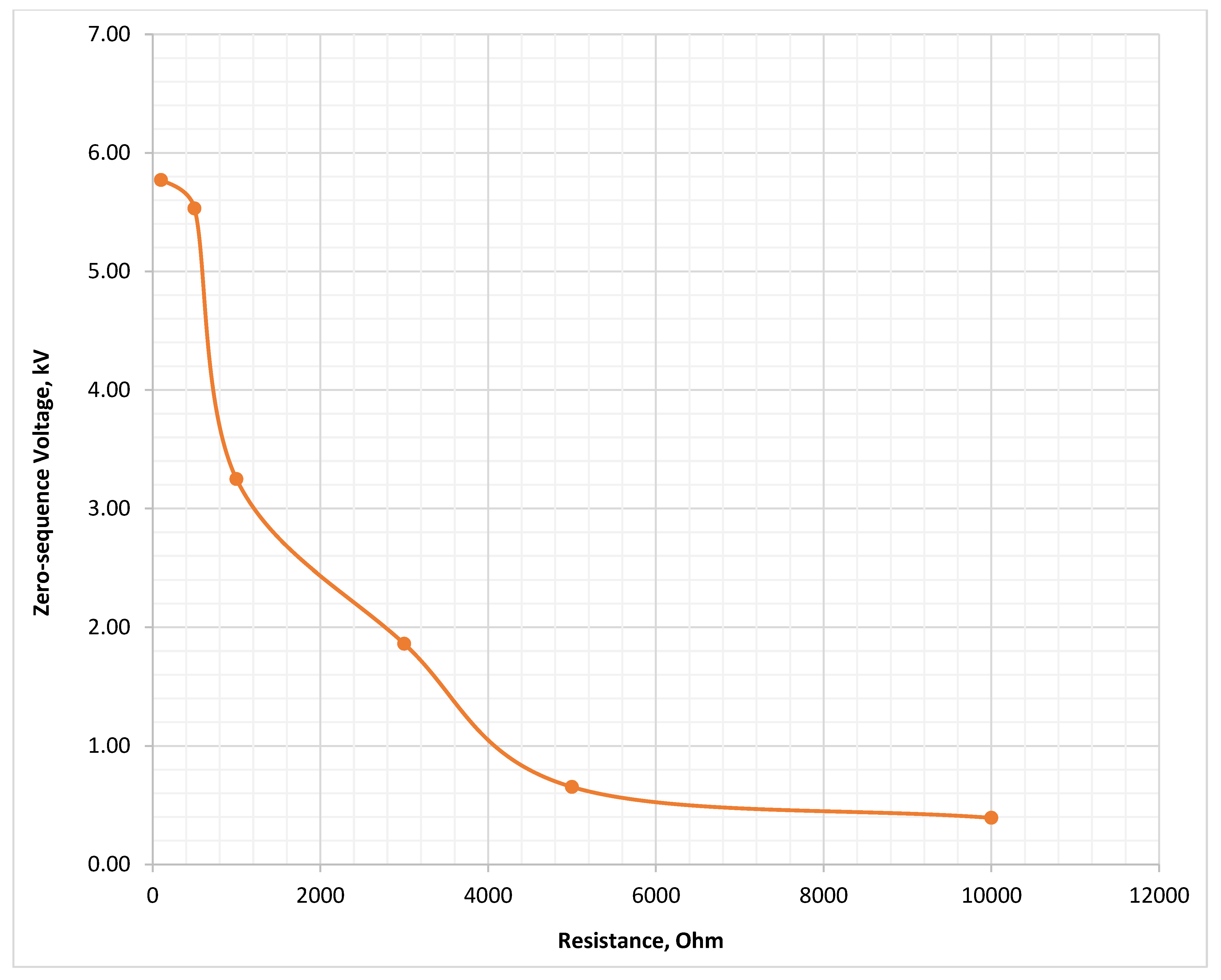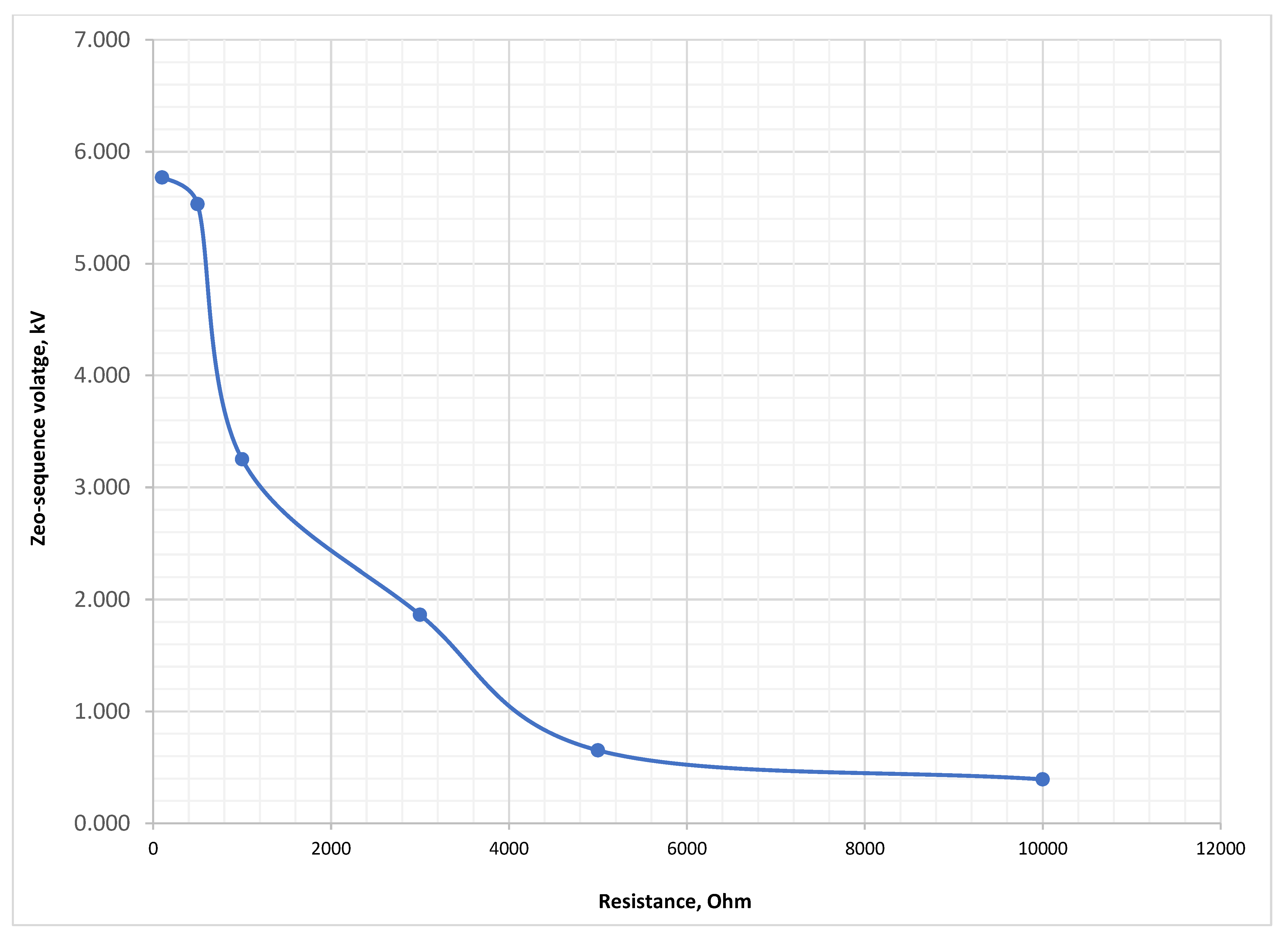 The presence of transient resistance during an SPGF leads to a reduction in protection sensitivity, thereby undermining the reliability and efficiency of MV networks configured with isolated neutrals. In practice, incomplete ground faults are frequently accompanied by transient resistance, which can range from a few Ohms to several kilo-Ohms [7,18]. These resistance values are random and depend on various factors, such as the presence of moisture, icing, tree branches, and the soil’s specific properties. During SPGFs with transient resistance, the magnitudes of zero-sequence current and voltage are significantly reduced. Since the settings for ground overcurrent protections are typically calculated assuming bolted faults (i.e., near-zero resistance faults), the failure to account for transient resistance may result in the protection system failing to detect and isolate the fault [10,11,20]. Moreover, transient resistance affects not only traditional ground overcurrent protections but also protections based on detecting higher harmonic components in the steady-state SPGF current. Studies show that transient resistances of just a few Ohms can lead to substantial sensitivity degradation [11,21]. Directional overcurrent protections that determine the direction of zero-sequence current under steady-state fault conditions offer somewhat better performance. Nonetheless, analysis reveals that even these protections exhibit low selectivity for SPGFs when transient resistances reach values between 600 and 700 Ohms, particularly in networks with a maximum distributed capacitance of around 6.5 μF. Figure 1 illustrates the relationship between SPGF conditions and transient resistance values for soils with high specific resistivity [7,29].