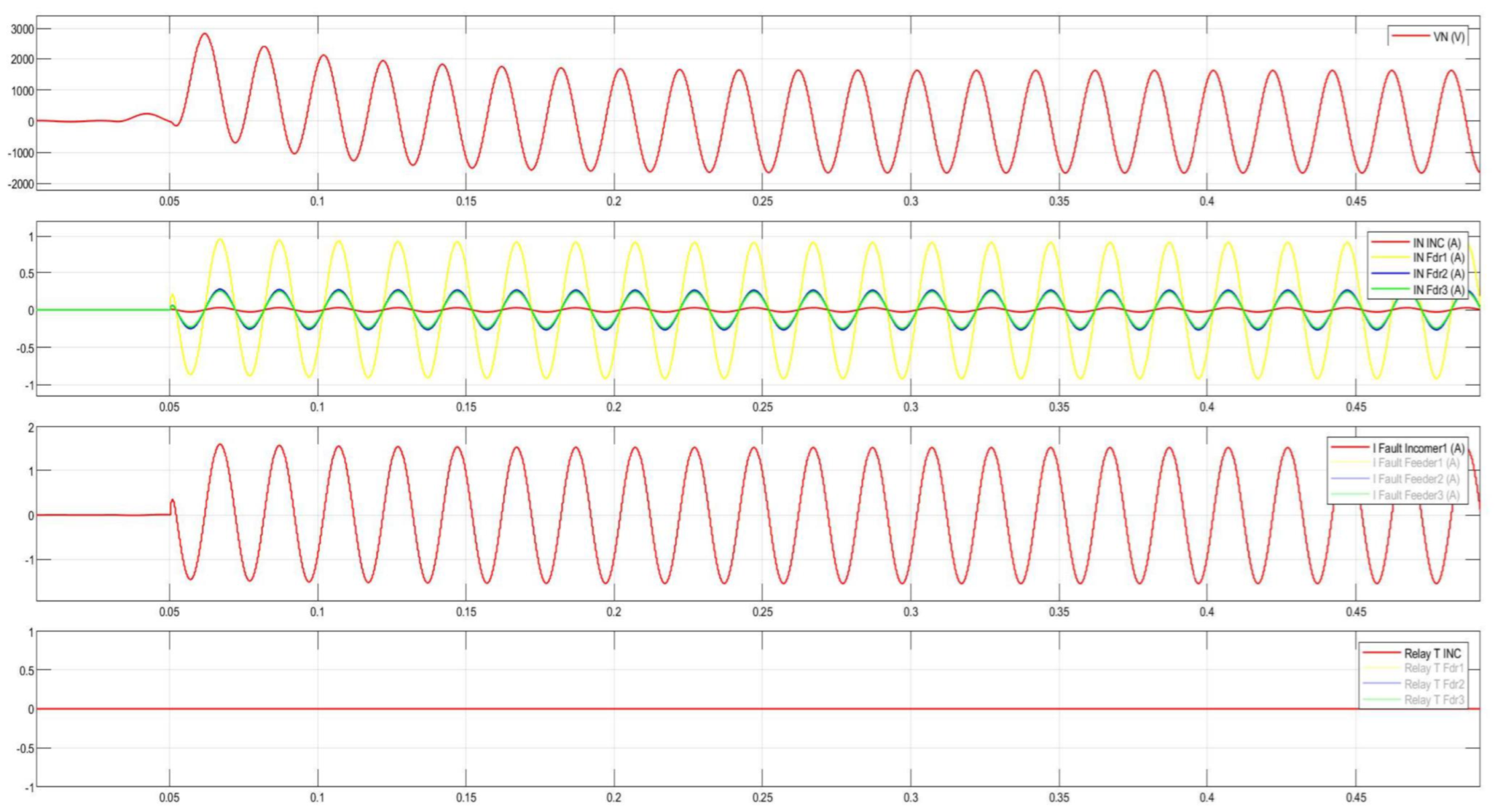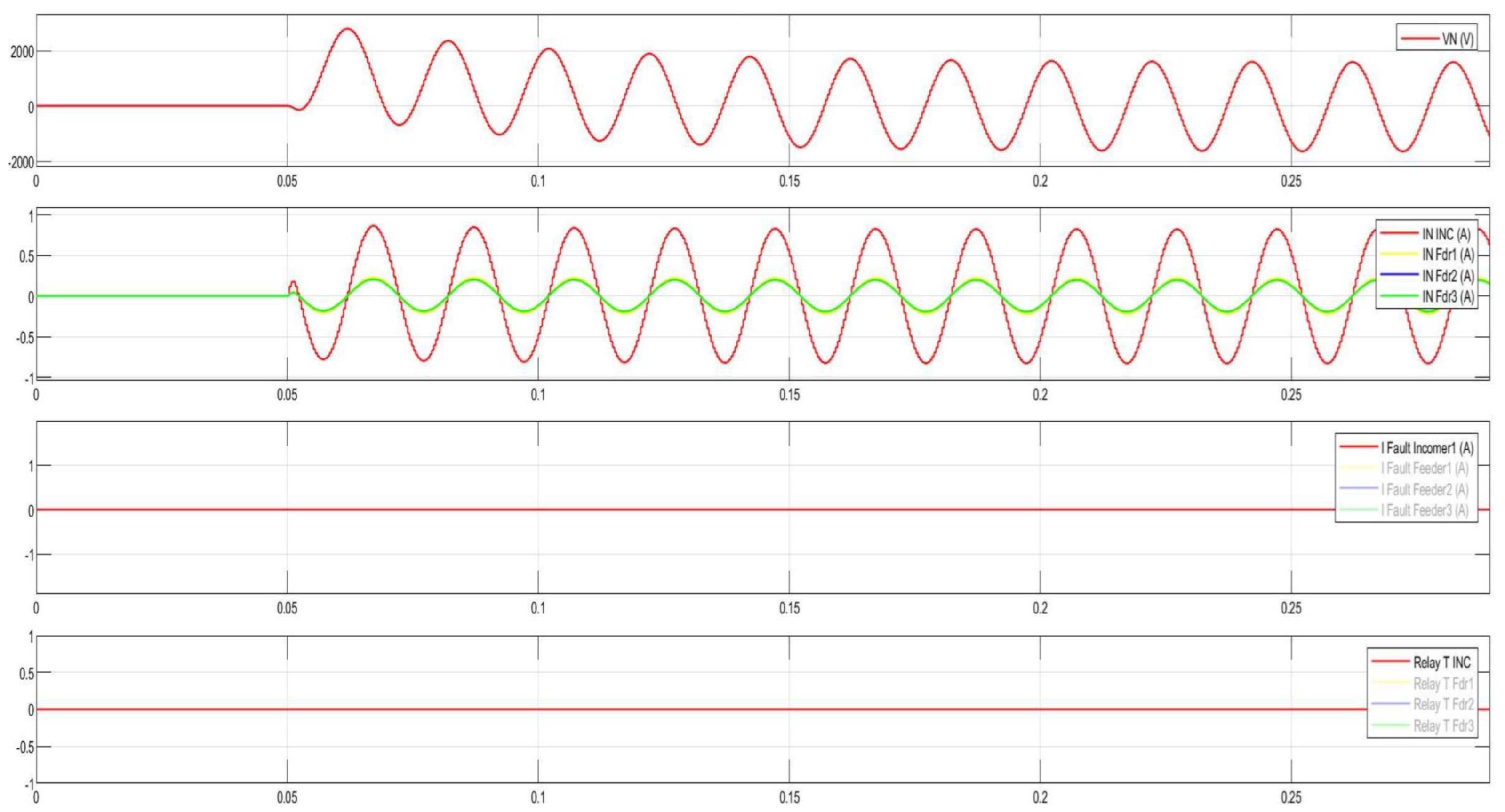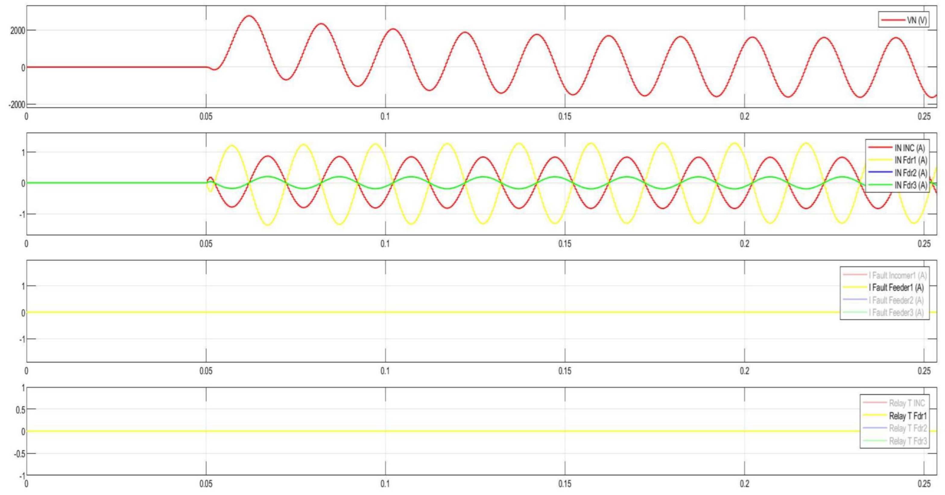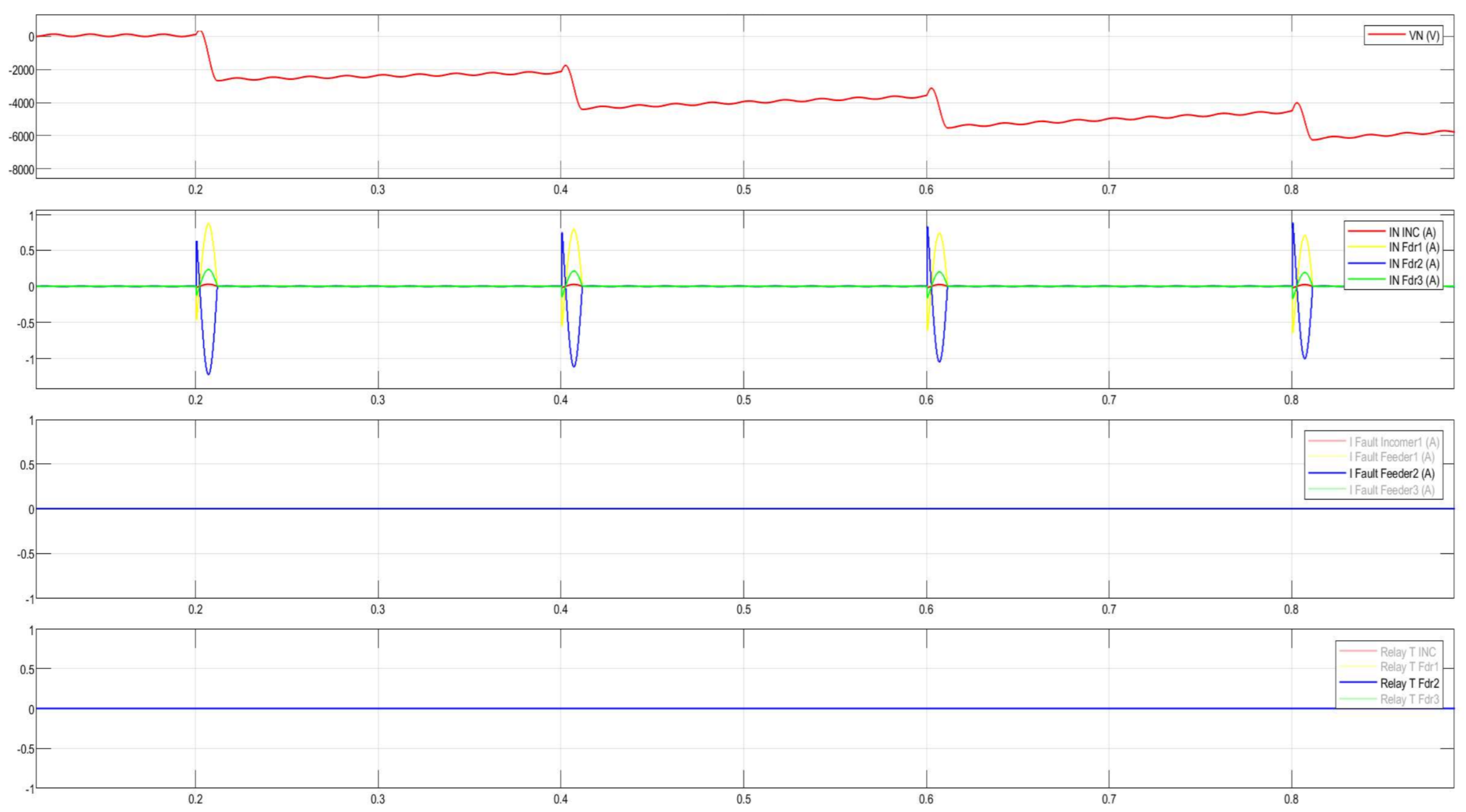 SPGFs were applied sequentially at different locations (bus and feeders) with transient resistance R f varying from 1 Ohm to 10 kOhm, allowing analysis of protection response under resistive and capacitive fault conditions.