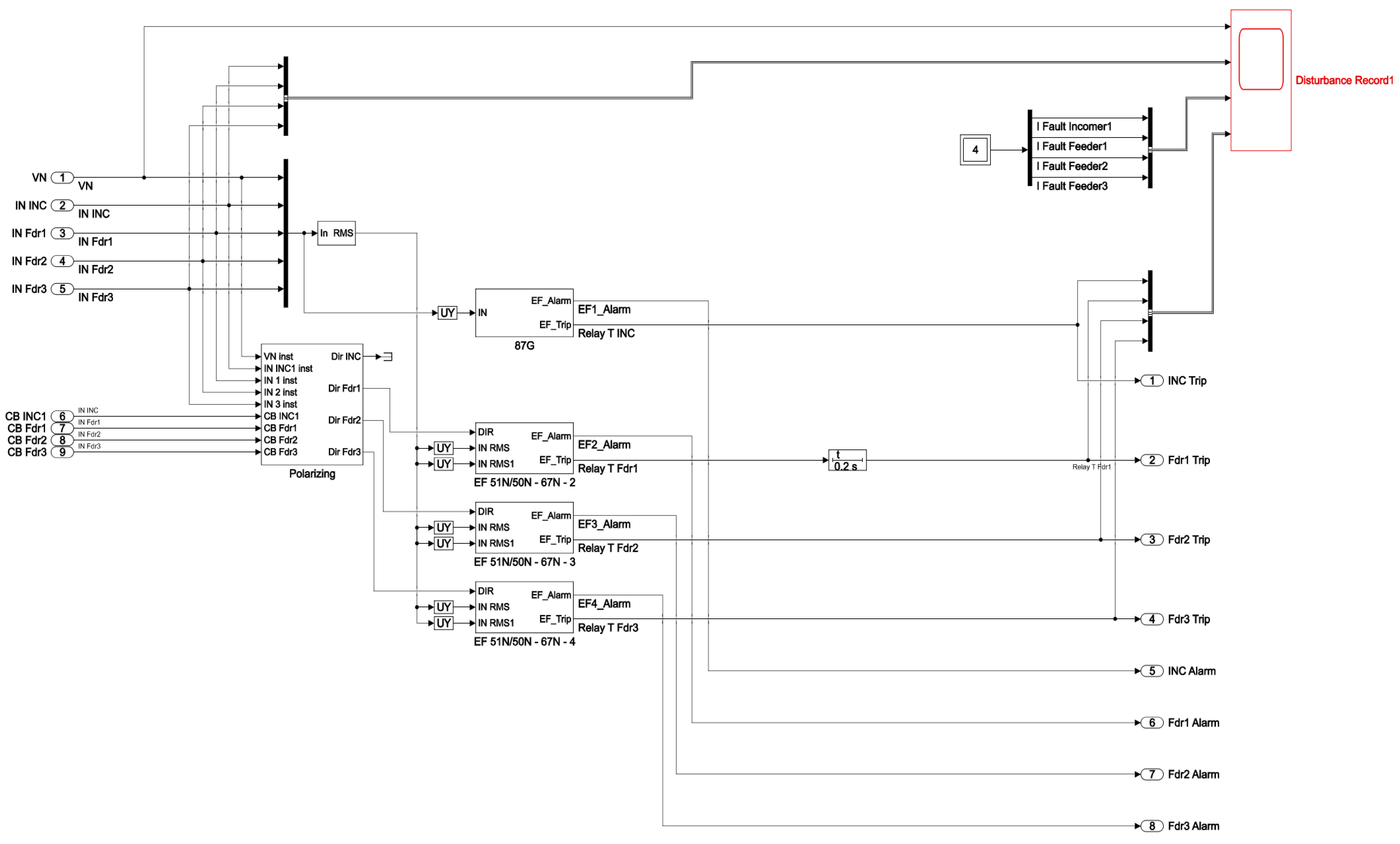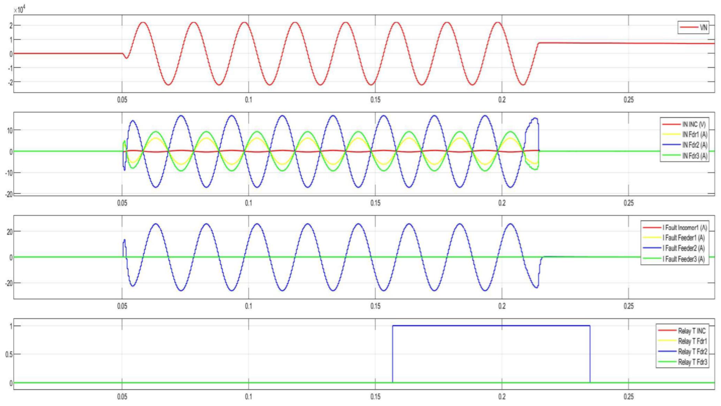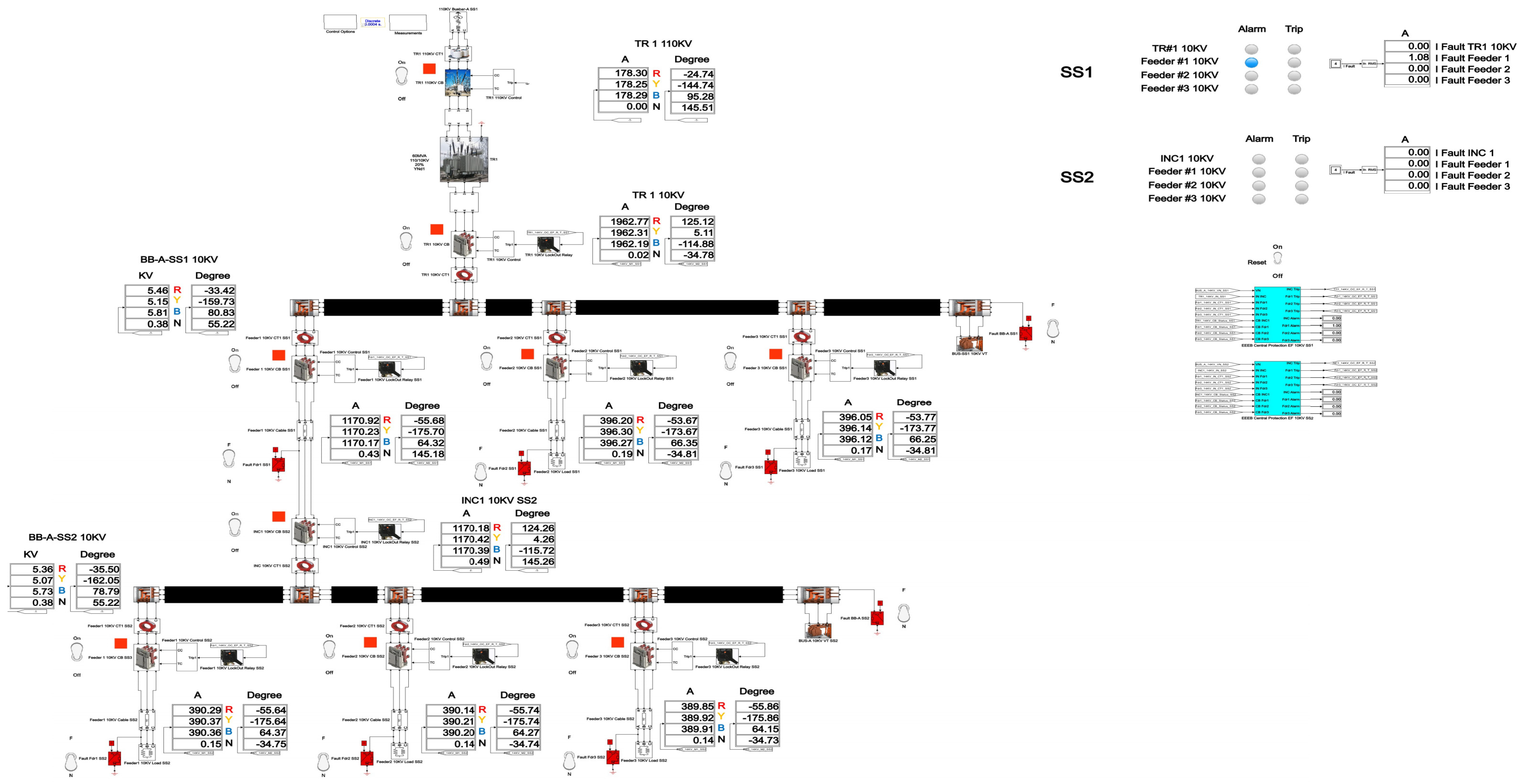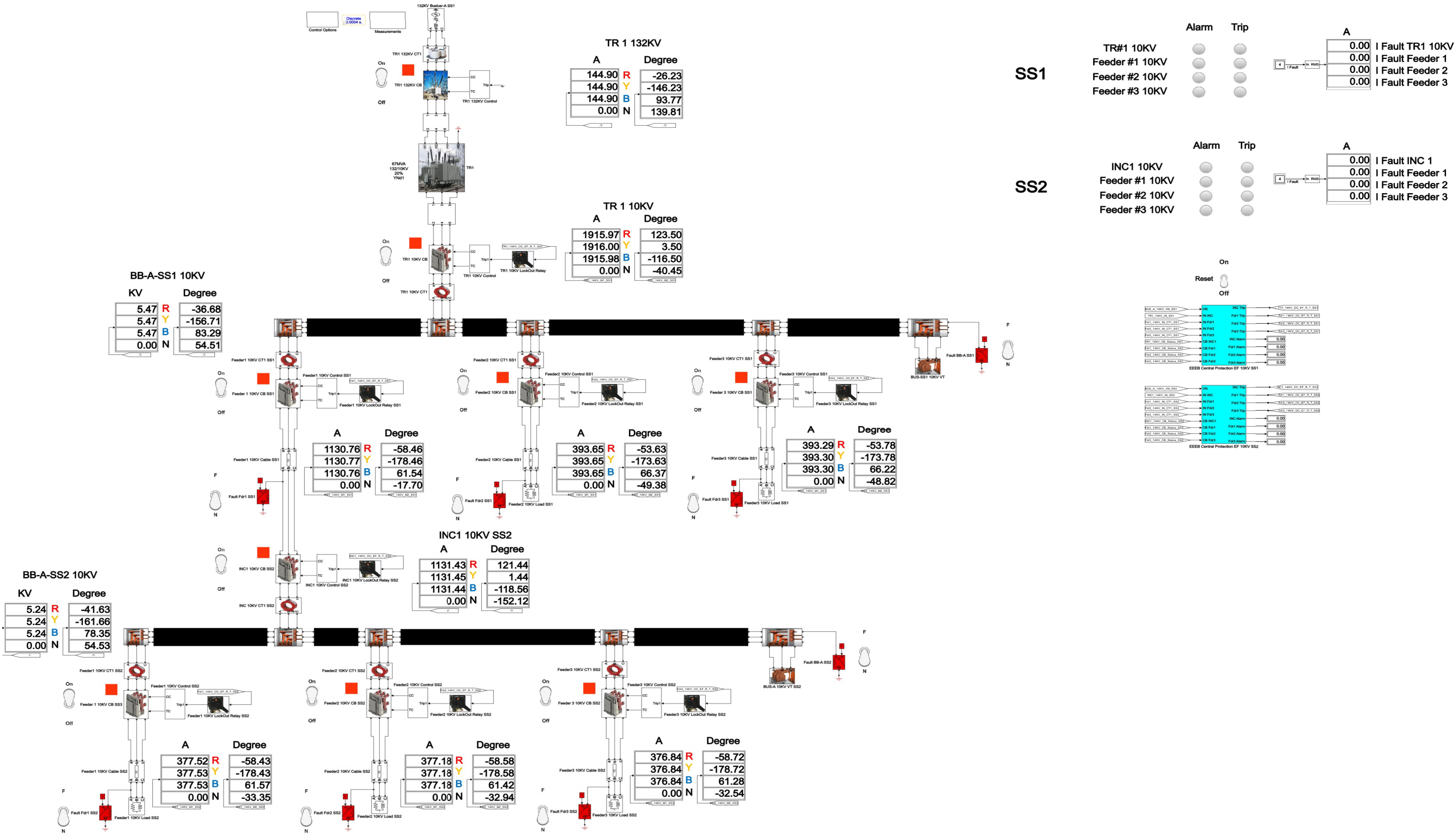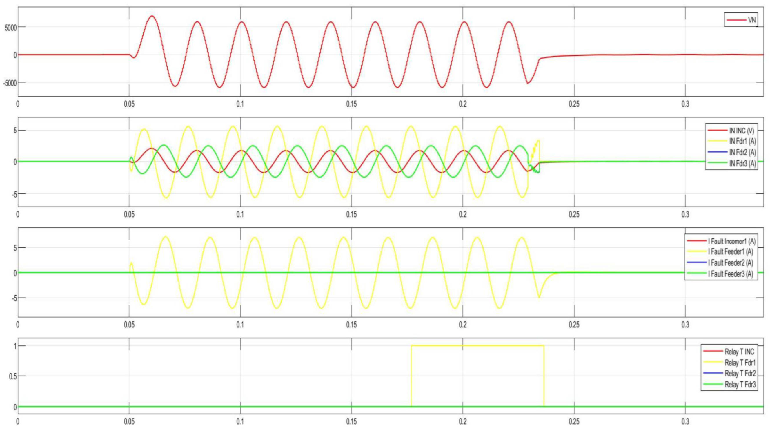 SPGFs were applied sequentially at different locations (bus and feeders) with transient resistance R f varying from 1 Ohm to 10 kOhm, allowing analysis of protection response under resistive and capacitive fault conditions.