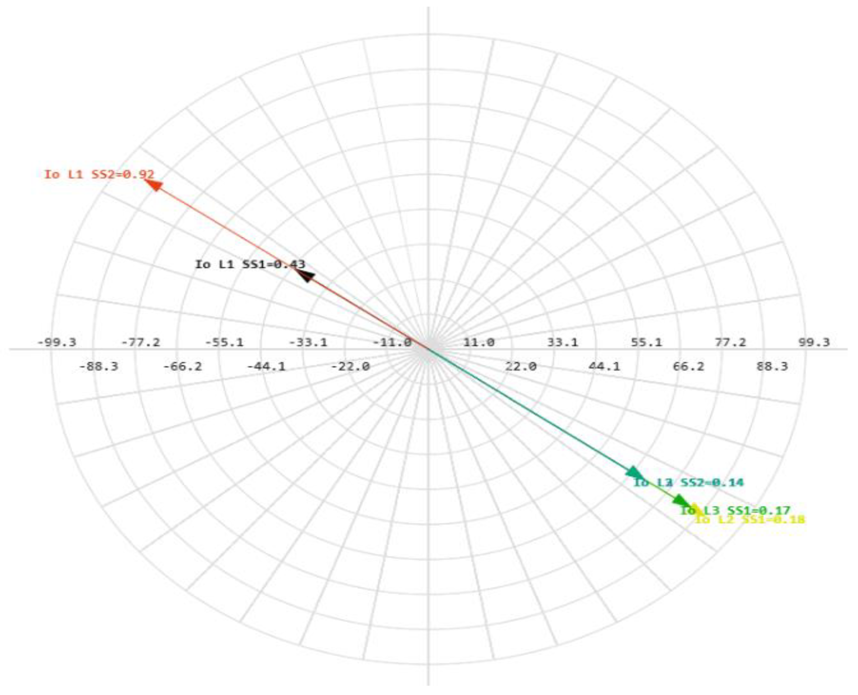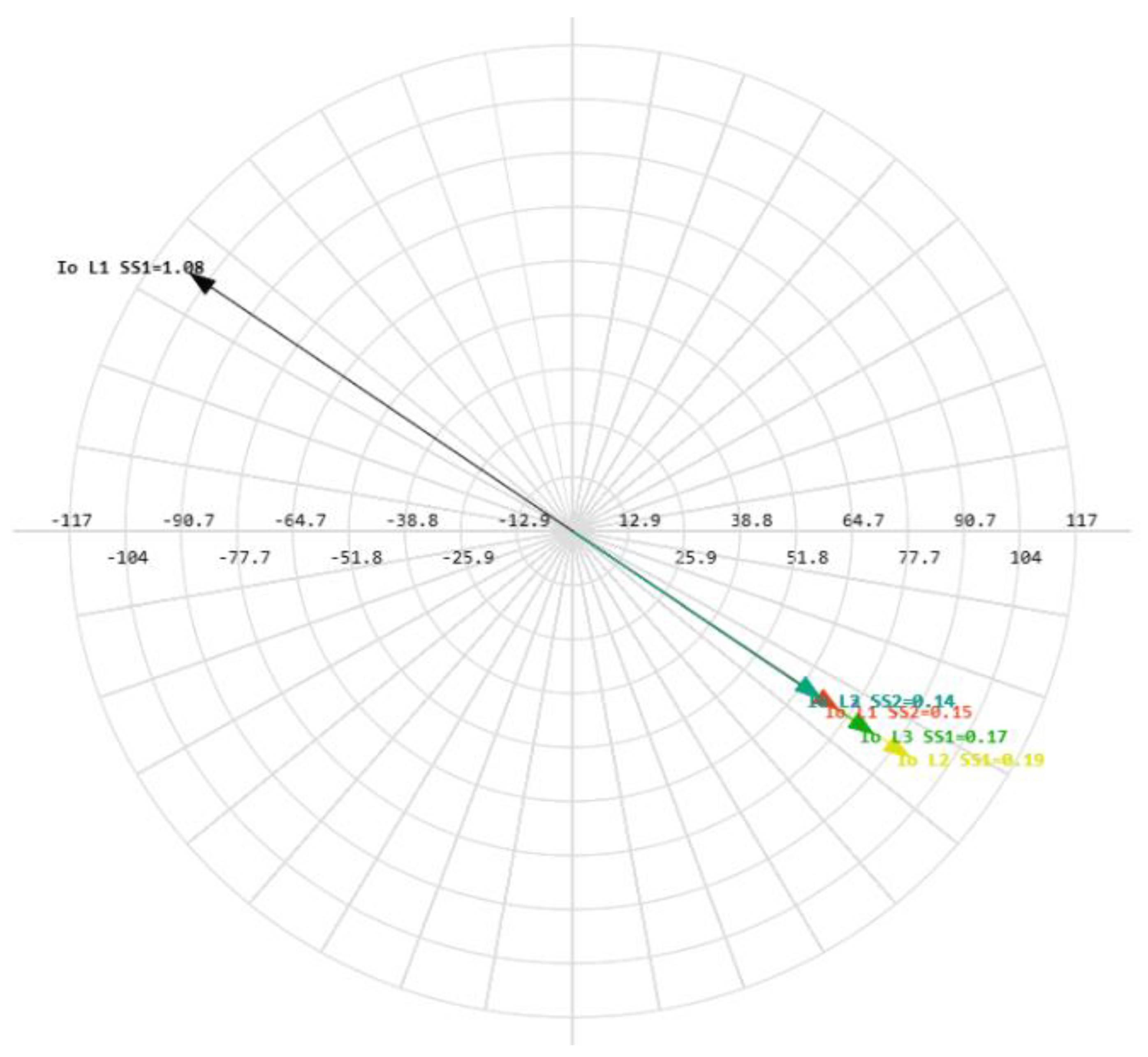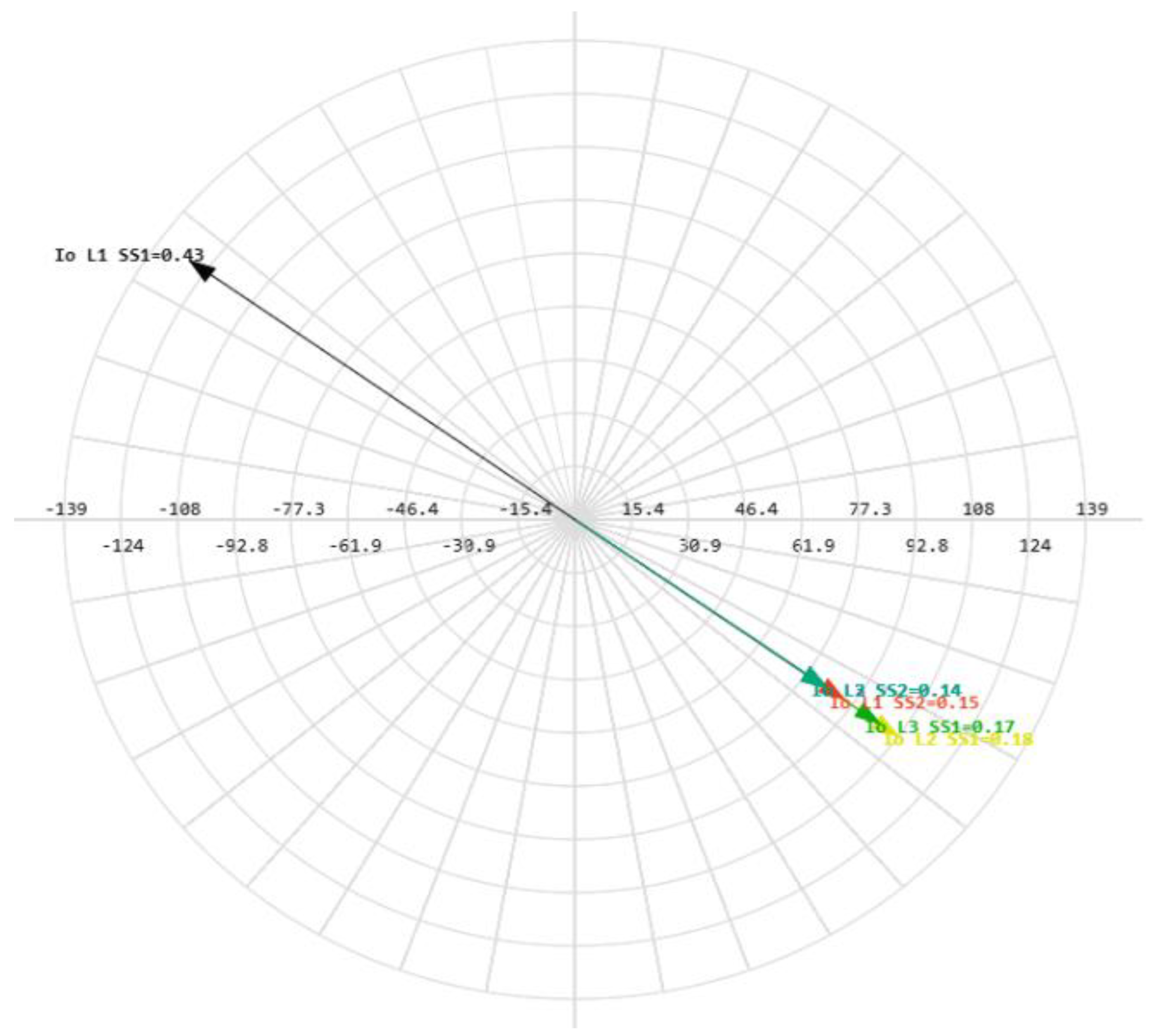 Capacitive Current at the Feeder No.3, Substation No.1, AGround Fault Current at the Feeder No.1, Substation No.2, ACapacitive Current at the Feeder No.2, Substation No.2, ACapacitive Current at the Feeder No.3, Substation No.2, A