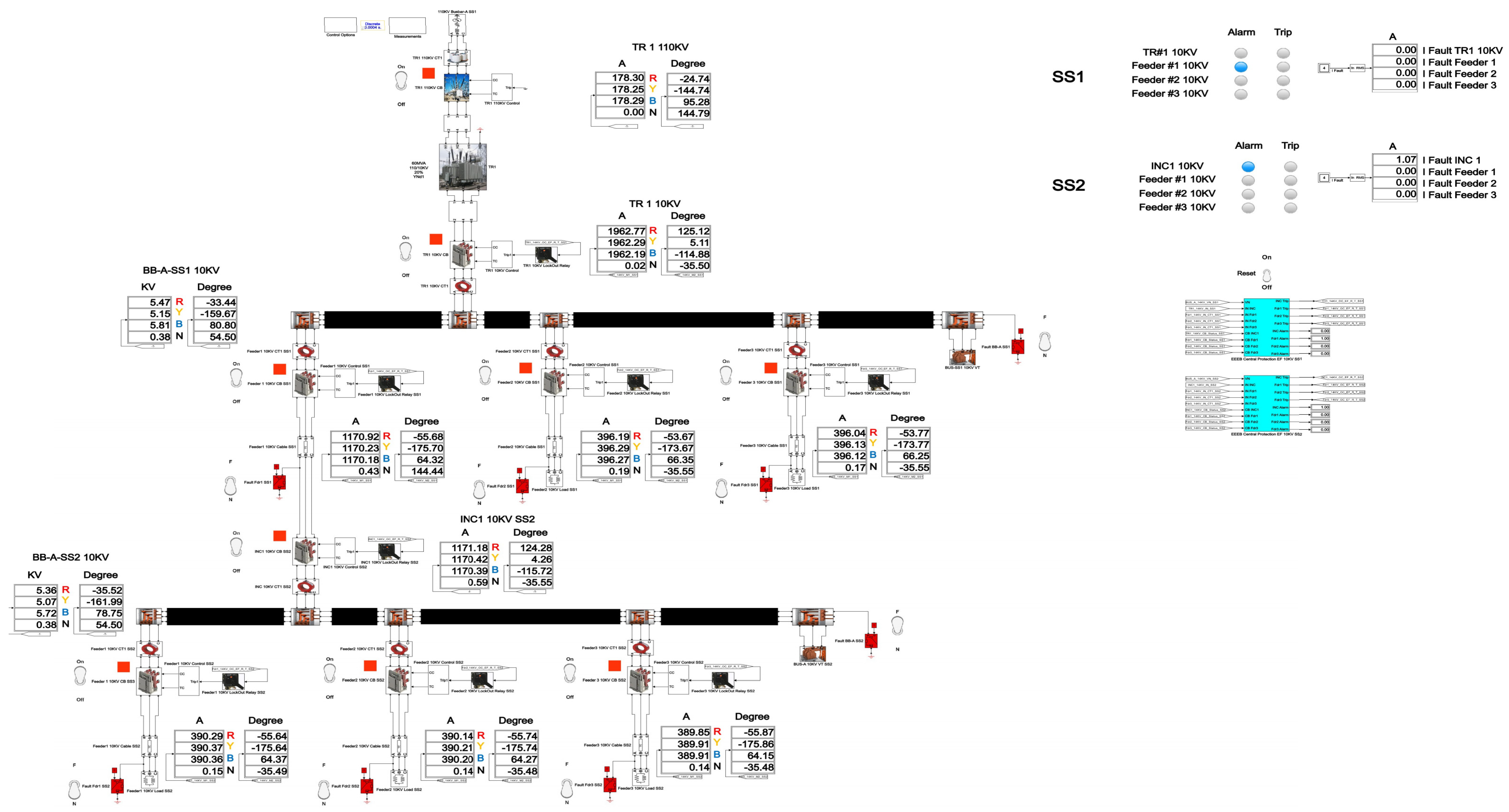 A 10 kV network model with two substations and six outgoing feeders was developed using MATLAB Simulink R2024b (The MathWorks Inc., Natick, MA, USA).