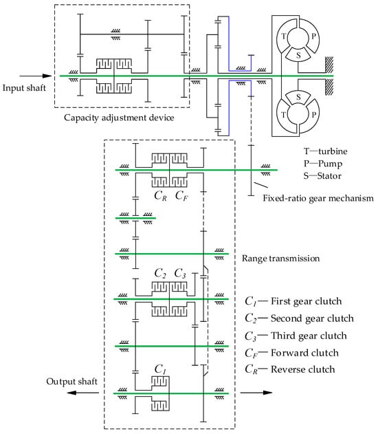 Hydrodynamic transmission has been widely adopted in the construction machinery industry due to its strong self-adaptive capability to external loads and its vibration-damping performance [1]. However, the energy conversion process in hydrodynamic transmission is indirect: mechanical energy is first converted into fluid kinetic energy and then back into mechanical energy, resulting in relatively low transmission efficiency. With increasingly stringent requirements for energy conservation and emissions reduction, these drawbacks have become more pronounced [2]. A power-cycling hydrodynamic mechanical transmission (PCHMT) places the torque converter on a branch of the overall power transmission path, thereby combining the advantages of flexible hydrodynamic transmission with those of high-efficiency mechanical transmission [3,4]. In addition, the capacity adjustment device within the PCHMT allows the engine to achieve effective matching with the transmission in both loading and hauling modes, further reducing vehicle fuel consumption. As a result, the PCHMT represents a promising transmission technology with significant application potential.