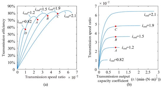 As shown in Figure 2a, when the transmission speed ratio lies to the left of the intersection point of the two curves (iPCHMT < iD), a smaller speed ratio icad of the capacity adjustment device results in higher transmission efficiency. From the perspective of conventional forward design, selecting a smaller icad would therefore appear beneficial for improving the loader’s fuel economy. However, Figure 2b shows that under identical load conditions, the operating speed ratio of the transmission varies with different capacity adjustment speed ratios. A larger icad leads to a higher transmission speed ratio, which in turn produces higher transmission efficiency. Based on this observation, a larger speed ratio icad of the capacity adjustment device should be selected. Consequently, the design of the PCHMT should be optimized with reference to its output capacity characteristics rather than conventional forward design logic.
