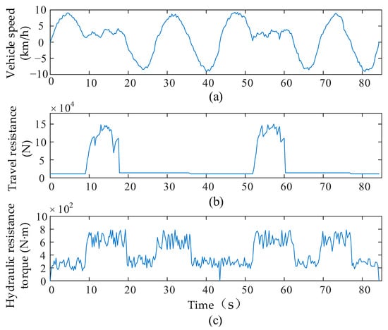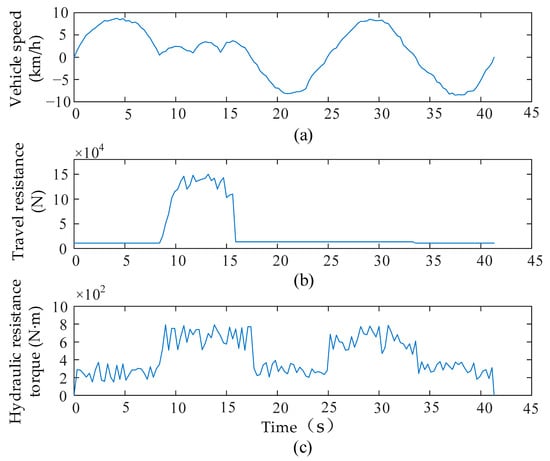 Typical loading–hauling cycle of the loader: (a) vehicle speed, (b) travel resistance, and (c) hydraulic resistance torque.