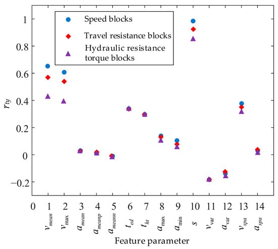 When clustering operational blocks, computational complexity must be considered, and the resulting operational conditions should provide meaningful guidance for new transmission design. Therefore, for each block type, the three feature parameters with the strongest correlation to fuel consumption are selected as representative features for clustering. The correlation coefficient rty between a feature parameter and fuel consumption is calculated as: