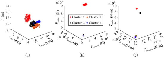 The clustering results are shown in Figure 7. The algorithm achieved excellent convergence: the 400 operational blocks for each operation condition were successfully classified into four categories (clusters). Clusters 1, 2, 3, and 4 represent the following operational phases of the loader, respectively: