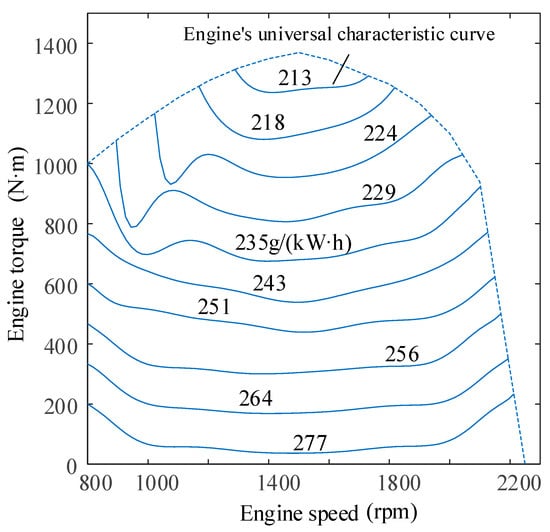 where represents the instantaneous fuel consumption rate of the engine, and x denotes the design variables. The engine’s universal characteristic map is shown in Figure 9.