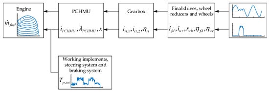 Before calculating the instantaneous fuel consumption rate of the loader, a steady-state mechanical model of the torque converter must be established. Due to space limitations, this section is omitted; the detailed modeling process and key structural parameters are available in [26]. The calculation procedure for the instantaneous fuel consumption rate is illustrated in Figure 10. First, the wheel speed and driving torque are obtained by inputting the vehicle speed and driving resistance into the vehicle dynamics equations. The input torque and speed of the PCHMT are then determined by tracing backward along the driveline power transmission path. Finally, by combining these with the known hydraulic resistance torque, the instantaneous fuel consumption rate is obtained through interpolation of the engine’s universal characteristic map.