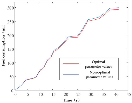 During the material handling and unloading phases, the capacity adjustment device operates in the second stage. In this phase, the transmission efficiency and capacity characteristics of the two parameter sets were similar. Nevertheless, as shown in Figure 13, the powertrain with optimal parameters maintained a notable efficiency advantage by enabling the engine to operate in a more efficient range. Consequently, as operating time increased, the energy-saving benefits of the optimal transmission system became more pronounced, ultimately reducing fuel consumption by 2.6% relative to the non-optimal transmission. These results demonstrate the effectiveness of the proposed design method for a PCHMT based on output capacity characteristics.