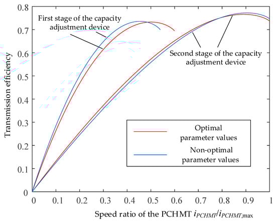 During the material-digging phase, the capacity adjustment device operates in the first stage. Across the entire speed ratio range, the average efficiency of the transmission with non-optimal parameters was 6.16% higher than that with optimal parameters. However, because the PCHMT is adaptive, the transmission with optimal parameters operated at a higher speed ratio under the same load, resulting in 2.6% lower fuel consumption compared with the non-optimal case.