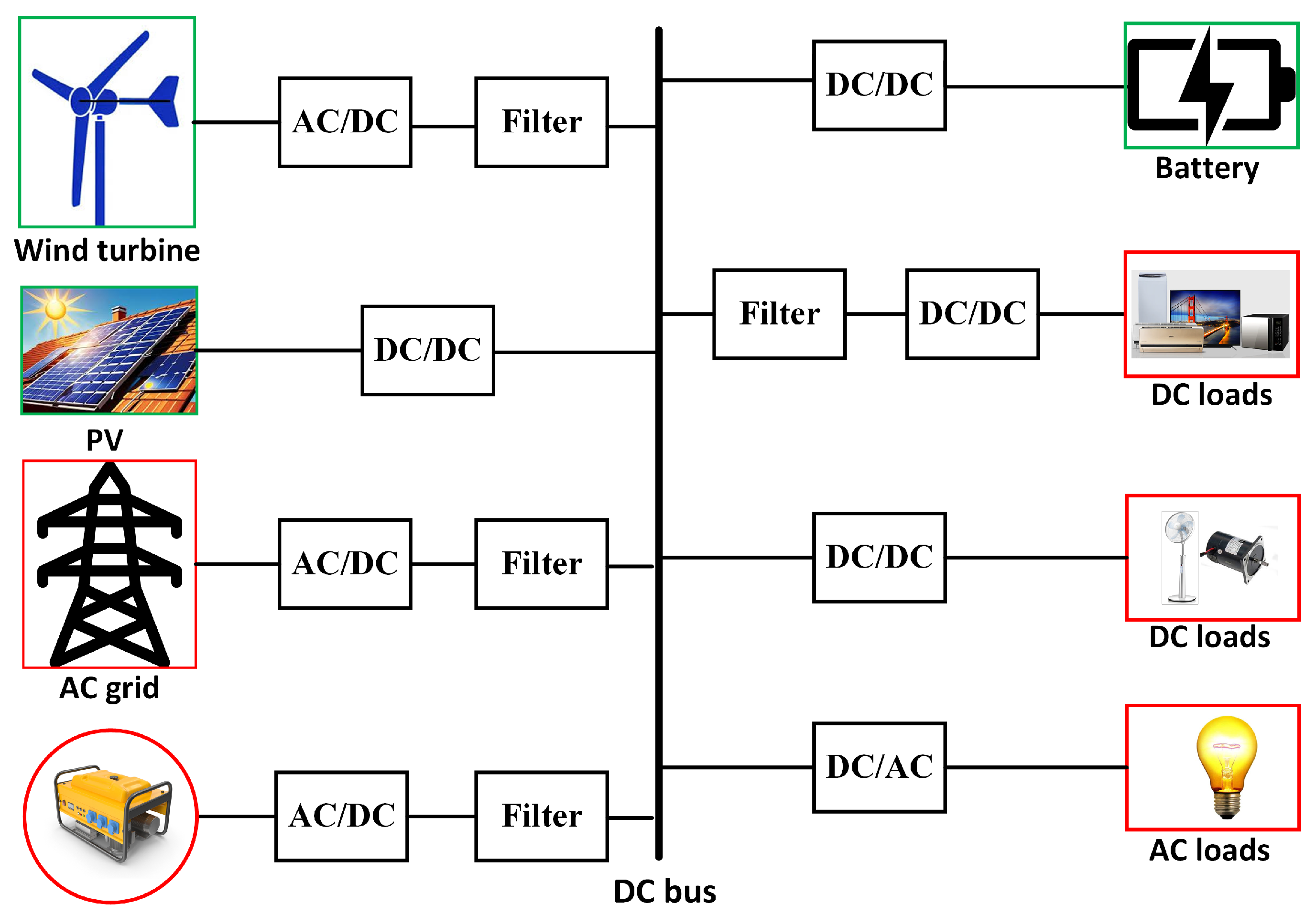 - Filters, such as commonly used LC types, improve power quality, but can reduce the damping ratio of DC MG, increasing the risk of instability [22].