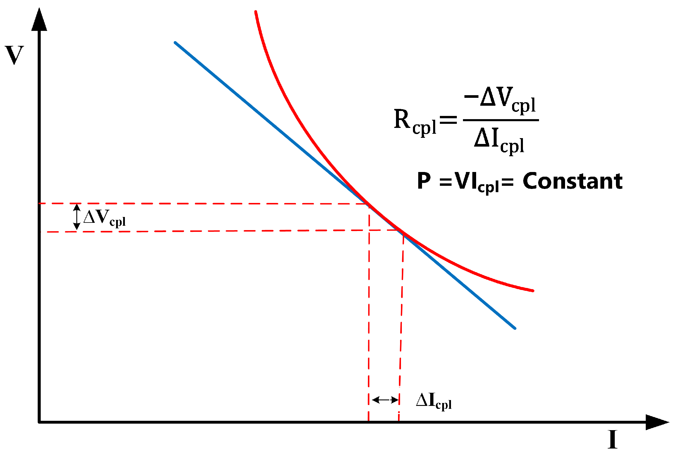 - CPL are nonlinear loads characterized by negative incremental impedance [17]. They maintain constant power consumption despite DC bus voltage fluctuates. DC load regulated by DC/DC converters often exhibits CPL behavior, which can destabilize the system. Voltage instability caused by CPL has been extensively studied [18,19]. Figure 2 illustrates this negative incremental impedance behavior.
