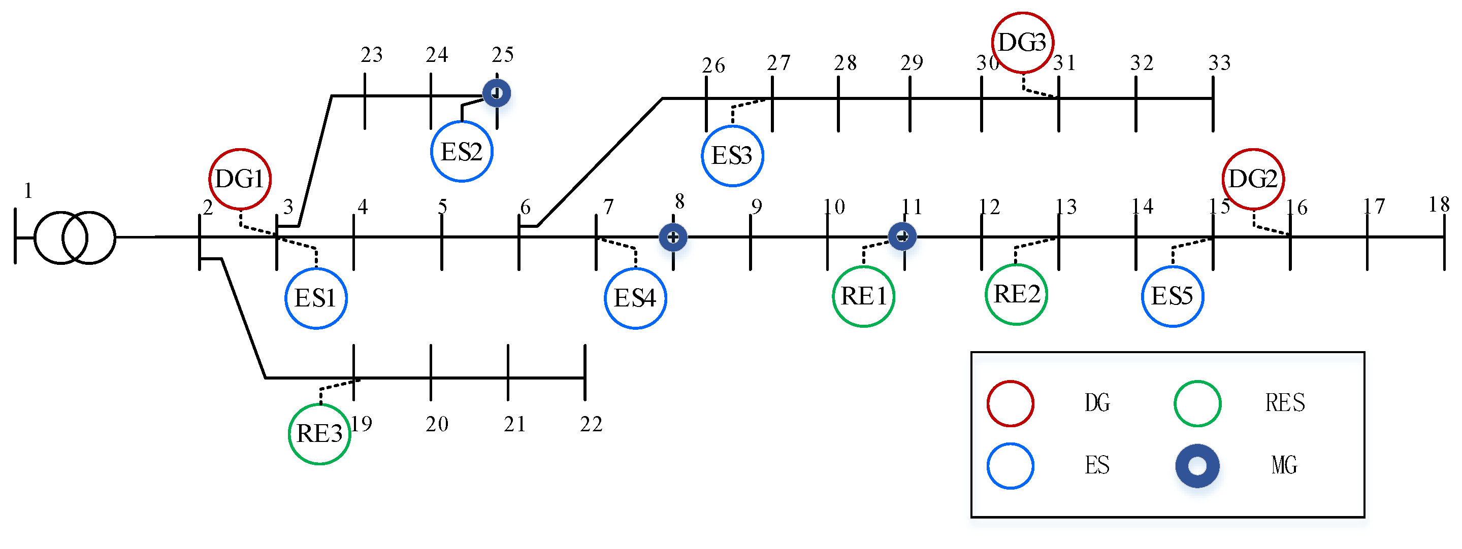 - Hao, P.; Huang, C.; Wang, C.; Li, K.; Tan, Z. Non-Iterative Coordinated Optimal Dispatch of Distribution System and Microgrids via Fast Approximation Equivalent Projection. IEEE Trans. Smart Grid 2025, 16, 3934–3948. [Google Scholar] [CrossRef]
