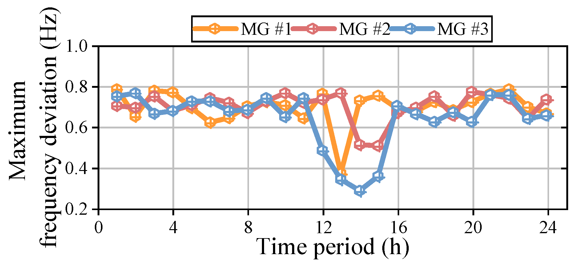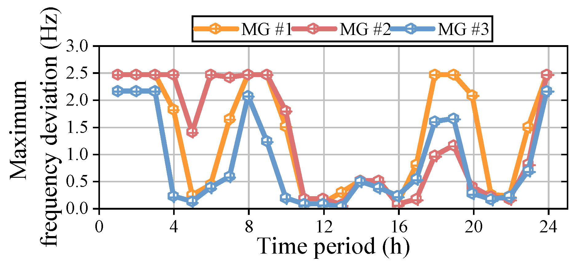 - Frequency constraints are essential in DN–MG coordination. Simulation results show that, without frequency constraints, the maximum frequency deviation of microgrids can reach 2.5 Hz, posing severe instability risks. In contrast, under the proposed method, the maximum deviation is suppressed within 0.8 Hz, significantly enhancing system security.