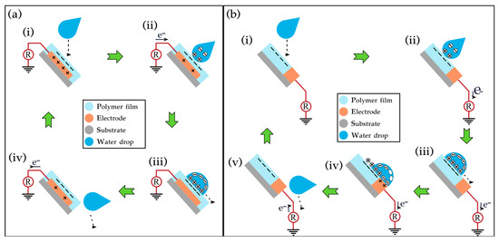 Figure 2 illustrates a comparative working mechanism of indirect and direct charge transfer processes in droplet-based liquid–solid TENGs. The mechanisms differ based on how charge transfer occurs—either indirectly through electrostatic induction or directly by contact with the CCE. The indirect mechanism involves water droplets interacting with a dielectric surface, creating an EDL through CE [18,19]. Upon contact with a polymer film surface, surface group ionization leads to negative charge accumulation on the polymer, while the droplet acquires a positive charge to maintain overall neutrality (Figure 2(a-i)). This interaction creates a potential difference as the positively charged droplet contacts the negatively charged polymer, forming an EDL. As the potential difference develops, electrons flow through an external circuit (Figure 2(a-ii)), generating an instantaneous current. The flow continues until the system reaches equilibrium (Figure 2(a-iii)). Once the droplet detaches from the polymer surface, a negative potential difference arises between the electrode and the ground, causing electron transfer to the ground to re-establish equilibrium (Figure 2(a-iv)). This process generates a potential difference, causing electron flow through an external circuit as droplets contact and detach from the polymer surface [26]. This repeated cycle generates a continuous AC, effectively converting mechanical energy from the droplet’s motion into electrical energy via electrostatic induction [12,18].