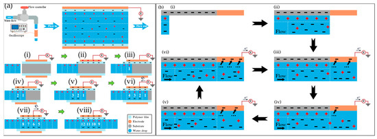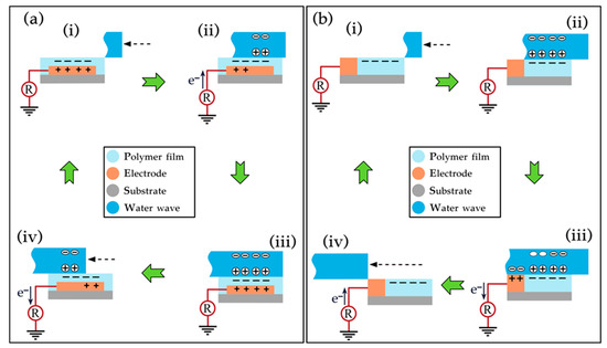 In the indirect charge transfer mechanism (illustrated in Figure 3a), water flow interacts with a hydrophobic polymer-coated electrode, utilizing a polymer film to modulate surface charge affinity. The process initiates as water waves approach and make contact with the polymer layer (Figure 3(a-i)). This interaction triggers surface group ionization, leading to negative charge accumulation on the polymer film while the water gains a positive charge to maintain charge neutrality [18,19]. Factors such as flow rate, water composition, and temperature can significantly impact charge transfer efficiency. As the water flow continues along the polymer-coated surface (Figure 3(a-ii)), an EDL forms at the interface, creating a potential difference that drives electron flow through an external circuit, producing an electrical current. This current persists until a state of electrostatic equilibrium is achieved between the interacting charges (Figure 3(a-iii)). As the water wave recedes from the polymer surface (Figure 3(a-iv)), the re-establishment of a potential difference between the electrode and the ground prompts electron flow back to the ground, completing the charge transfer cycle and generating a continuous AC. The efficiency of this approach can be influenced by factors such as the choice of polymer materials, the thickness, composition, length, and affinity of the dielectric layer, as well as other related properties [12,33].