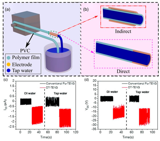 The LS-TENG designs presented in Figure 5 showcase two distinct charge transfer mechanisms: indirect charge transfer TENG (IT-TENG) and direct charge transfer TENG (DT-TENG). As illustrated in Figure 5a,b, the IT-TENG configuration incorporates a dielectric tube between the electrode and the liquid, preventing direct contact. In contrast, the DT-TENG design allows for direct contact between the electrode and the liquid, facilitating immediate charge transfer. Both configurations utilize a PVC tube as the primary structure, with deionized (DI) and tap water serving as the liquid medium for energy generation.