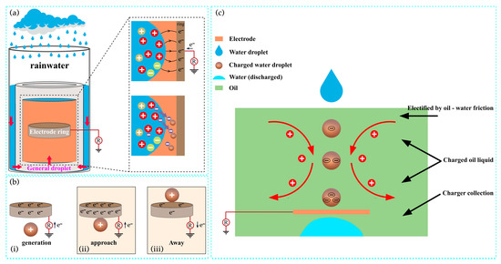 The design of the TENG system significantly influences charge transfer efficiency [11,12]. When the charged liquid makes direct contact with the CCE, direct charge transfer is initiated, leading to efficient triboelectric output with minimized losses [12,19]. In contrast, when the CCE is positioned behind an insulating layer, charge transfer occurs indirectly through electrostatic induction, offering enhanced device durability in specific applications despite a potential reduction in efficiency [11,19]. The charge transfer process in solid–liquid TENGs typically follows this sequence: (i) charges are induced on the triboelectric layer’s surface upon droplet contact according to electric double layer theory; (ii) as the droplets spread, charge transfer occurs; (iii) due to the hydrophobic nature of the triboelectric layer, droplets may subsequently rebound [12,26].