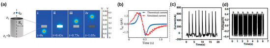 The comparison between direct and indirect charge transfer mechanisms reveals significant differences in current output, charge transfer efficiency, saturation time, and overall output characteristics. The underlying schematic and charge distribution simulation for the indirect mechanism are shown in Figure 7a,b. In the indirect charge transfer mechanism, the output current is limited to approximately 4.5–6.5 pA due to its reliance on ion adsorption and electrostatic induction at the interface. The periodic peaks in the output signal indicate repetitive charge transfer cycles, but the amplitude remains low, limiting energy transfer efficiency. The total transferred charge in the indirect method is measured to be approximately −5.3 pC, a consequence of charge transfer being constrained by resistance within the fluid and incomplete contact at the interface. Furthermore, the AC nature of the output in the indirect method necessitates additional AC-to-DC conversion for practical applications, leading to energy losses during the process.